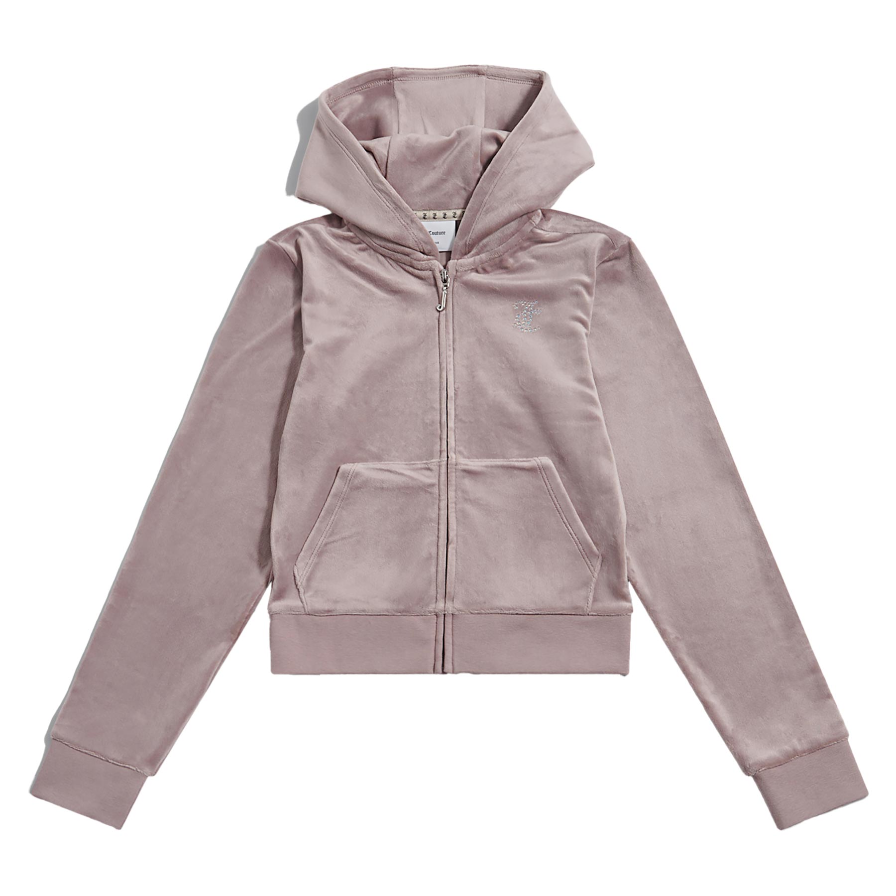 Juicy Couture girls zip though velour hoodie. Super soft stretchy velour hoodie with diamante Juicy logo on the chest, and diamante Juicy Couture logo across the shoulders at the back, front zipper with silver metal 'J' pull and pouch pocket on the front. Ribbed jersey cuffs and waistband. So comfortable to wear and looks amazing on. Other colours available. Matching joggers available.