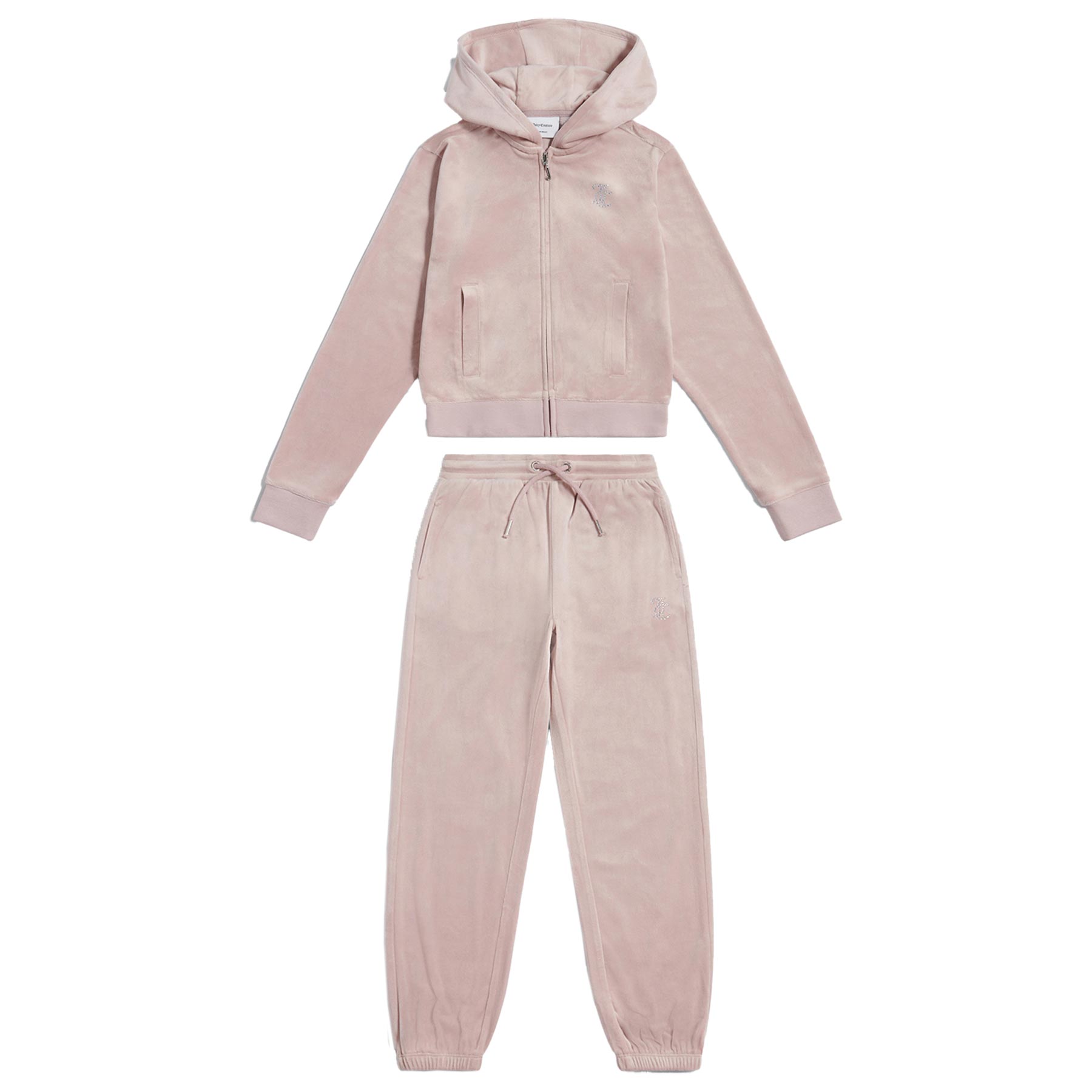 Juicy Couture girls zip though velour hoodie and relaxed joggers set with elasticated ankles. Super soft stretchy velour hoodie with diamante Juicy logo on the chest, and glitter and diamante Juicy Couture iconic logo across the shoulders at the back, front zipper with silver metal 'J' pull and side pockets. Ribbed jersey cuffs and waistband. Matching soft velour relaxed jogging bottoms with with elasticated ankles, with diamante logo and metal eyelets with cord and side and back pockets. So comfortable to wear and looks amazing on.