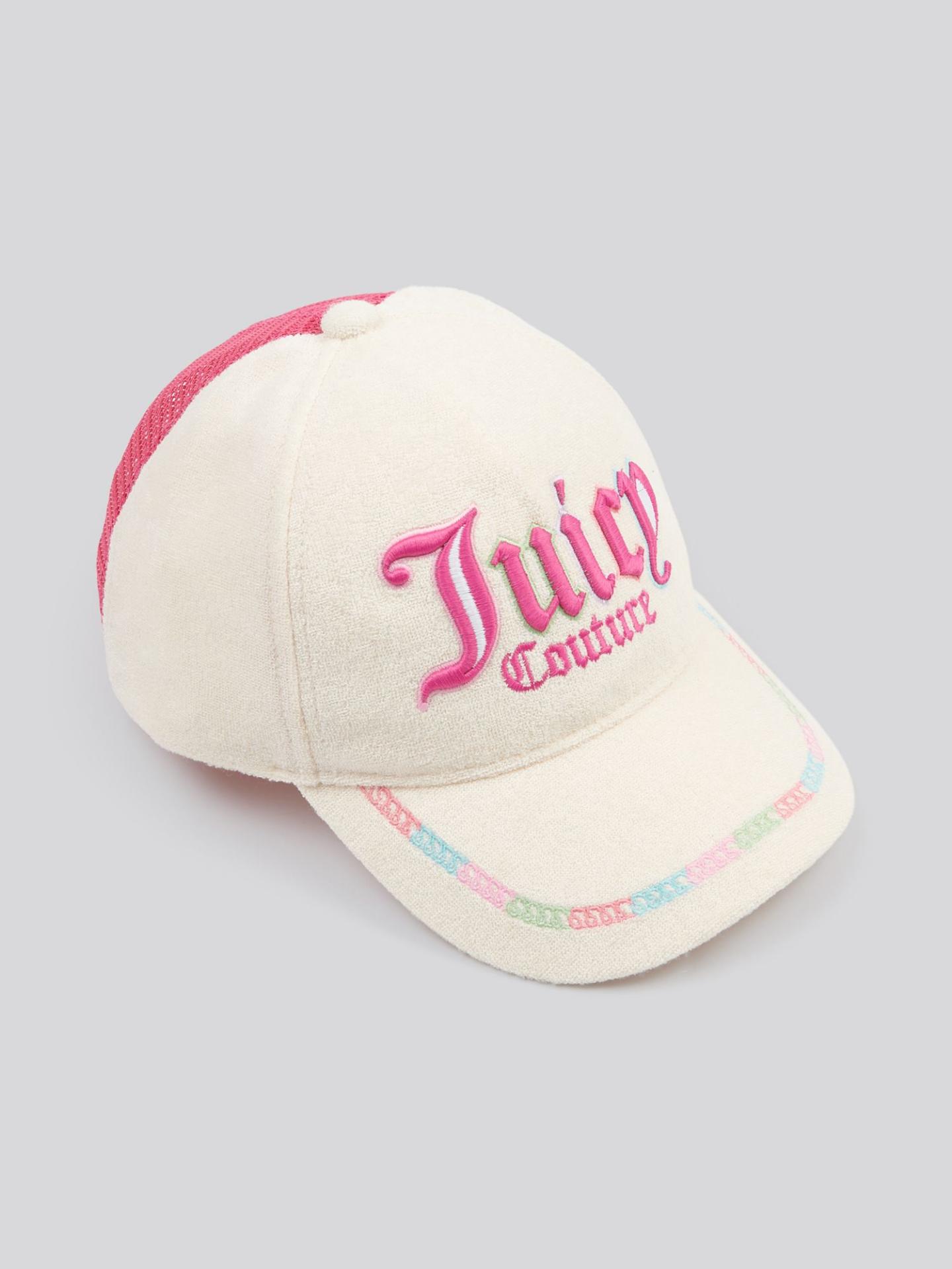 Juicy Couture new season - fabulous terry toweling cap with sun visor and mesh section at the back with adjustable tab - one size fits all - lined with sweat band - gorgeous multi coloured embroidered Juicy Couture Logo on the front with multi coloured link around the visor.