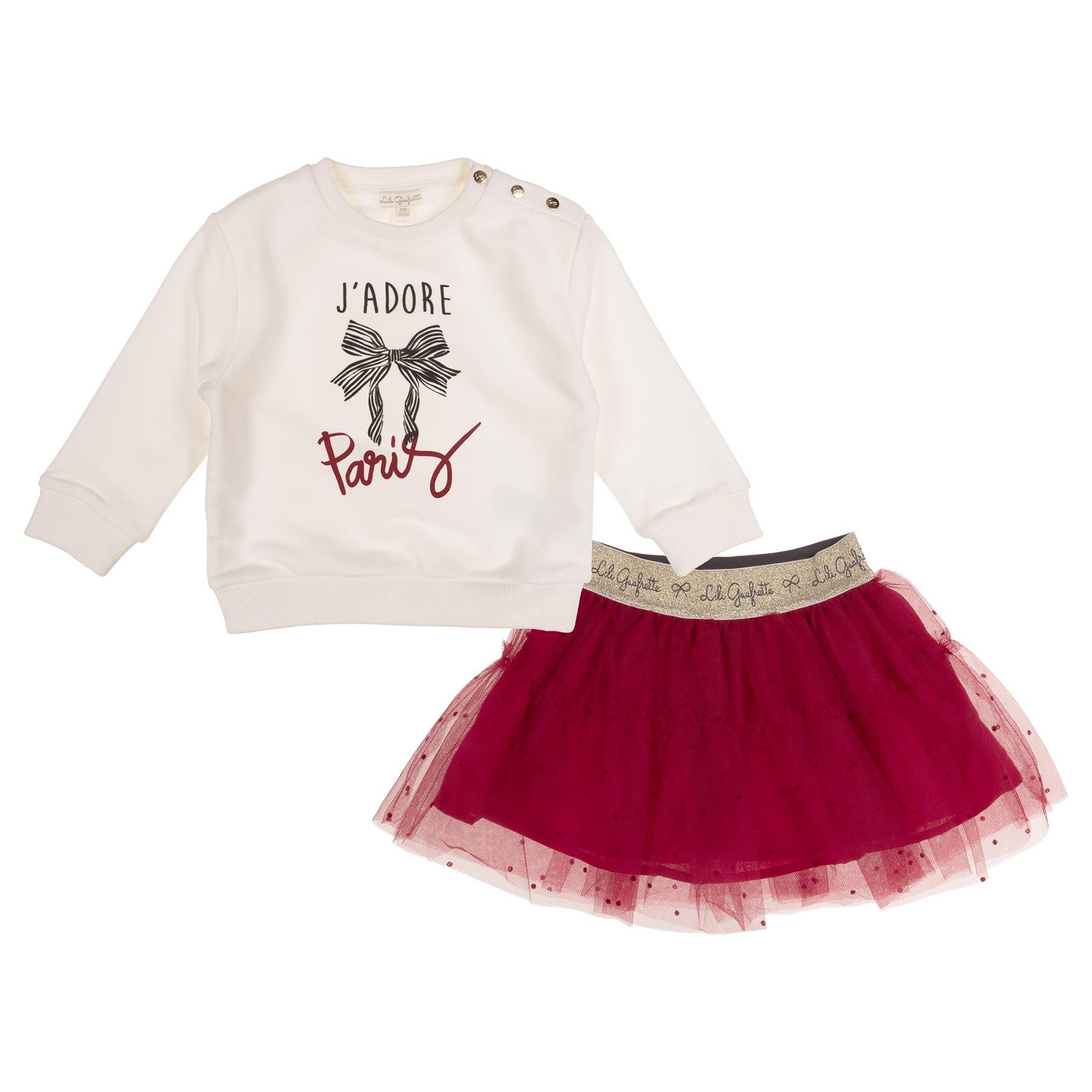Lili Gaufrette collection. This gorgeous set of long sleeve ivory cotton jersey top with J'Adore graphics on the front and gold poppers on the shoulder with bow logo - comes with soft polka tulle skirt lined with petticoat. Stretchy elastic waistband with Lili Gaufrette logo. Matches other items from the Lili Gaufrette collection.