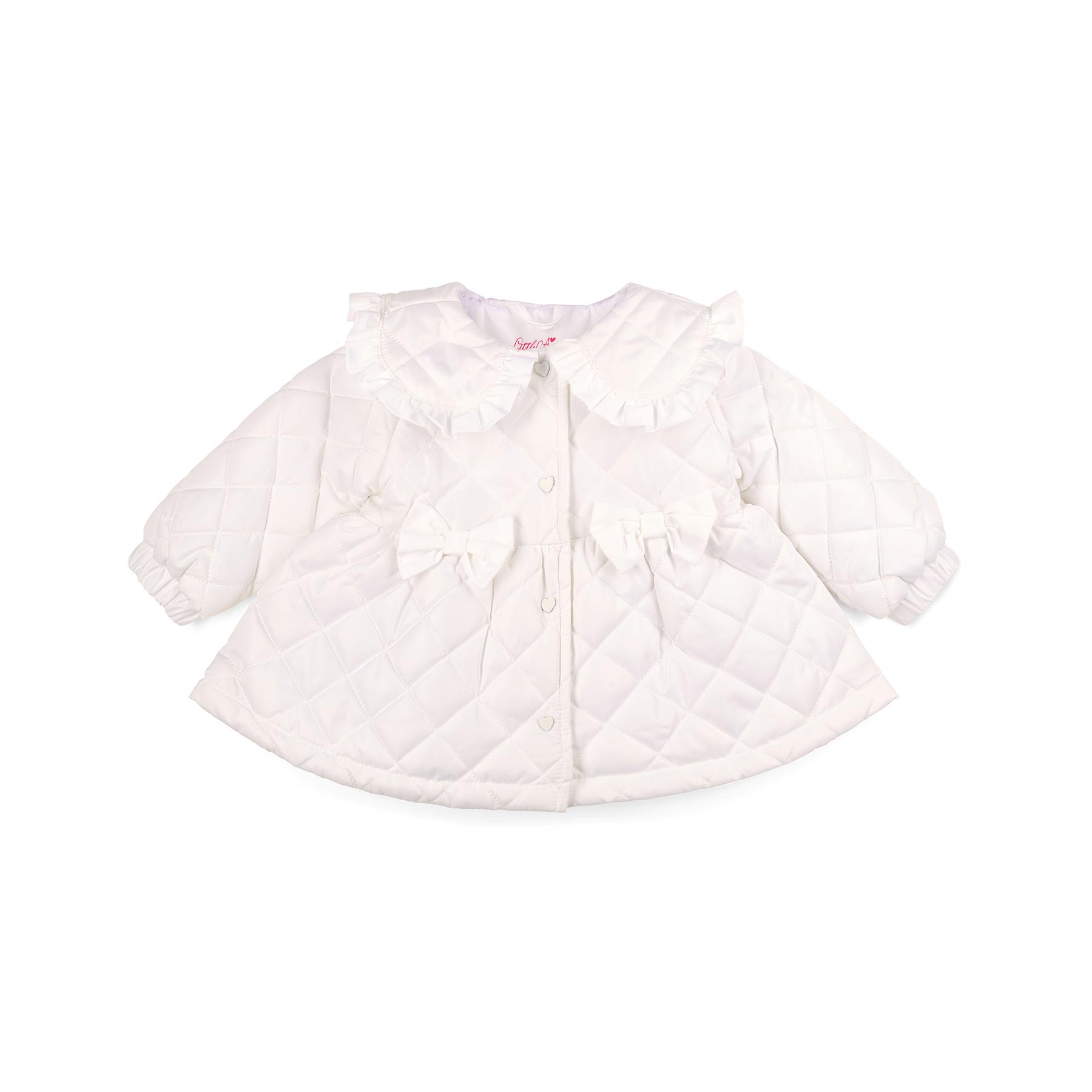 Little A Baby Girls Cutie Frutti Collection - the Penelope quilted jacket features two beautiful applique bows, a pretty frilled collar and button up front.  Perfect for baby sister/little sister outfits and newborn gifts.