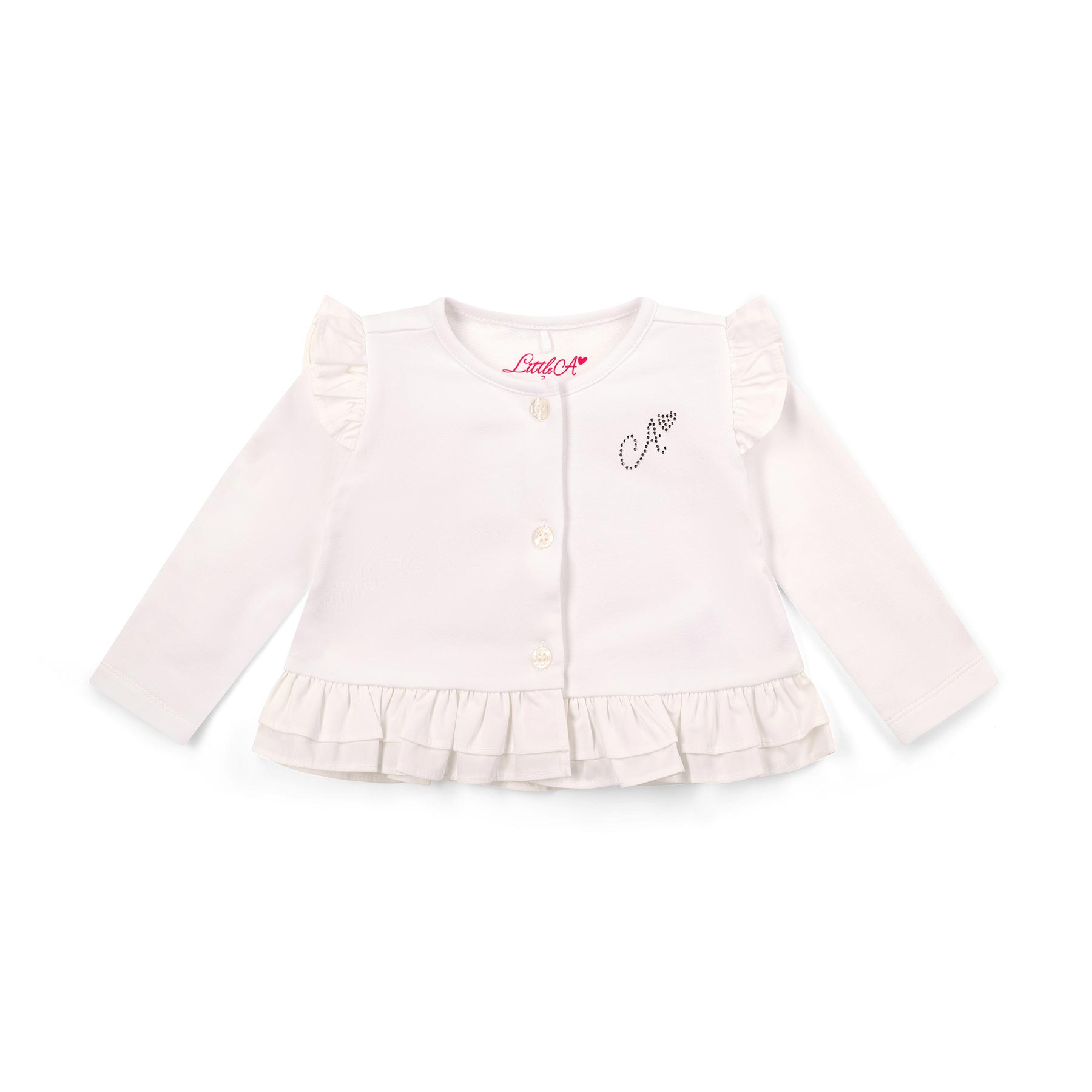 Little A Baby Girls Cutie Frutti Collection - the Penny cardigan features pretty frill shoulders and hem with a classic 'A' diamante logo.  Button up front - can be worn with many of the outfits in this collection.   Perfect for baby sister/little sister outfits and newborn gifts.