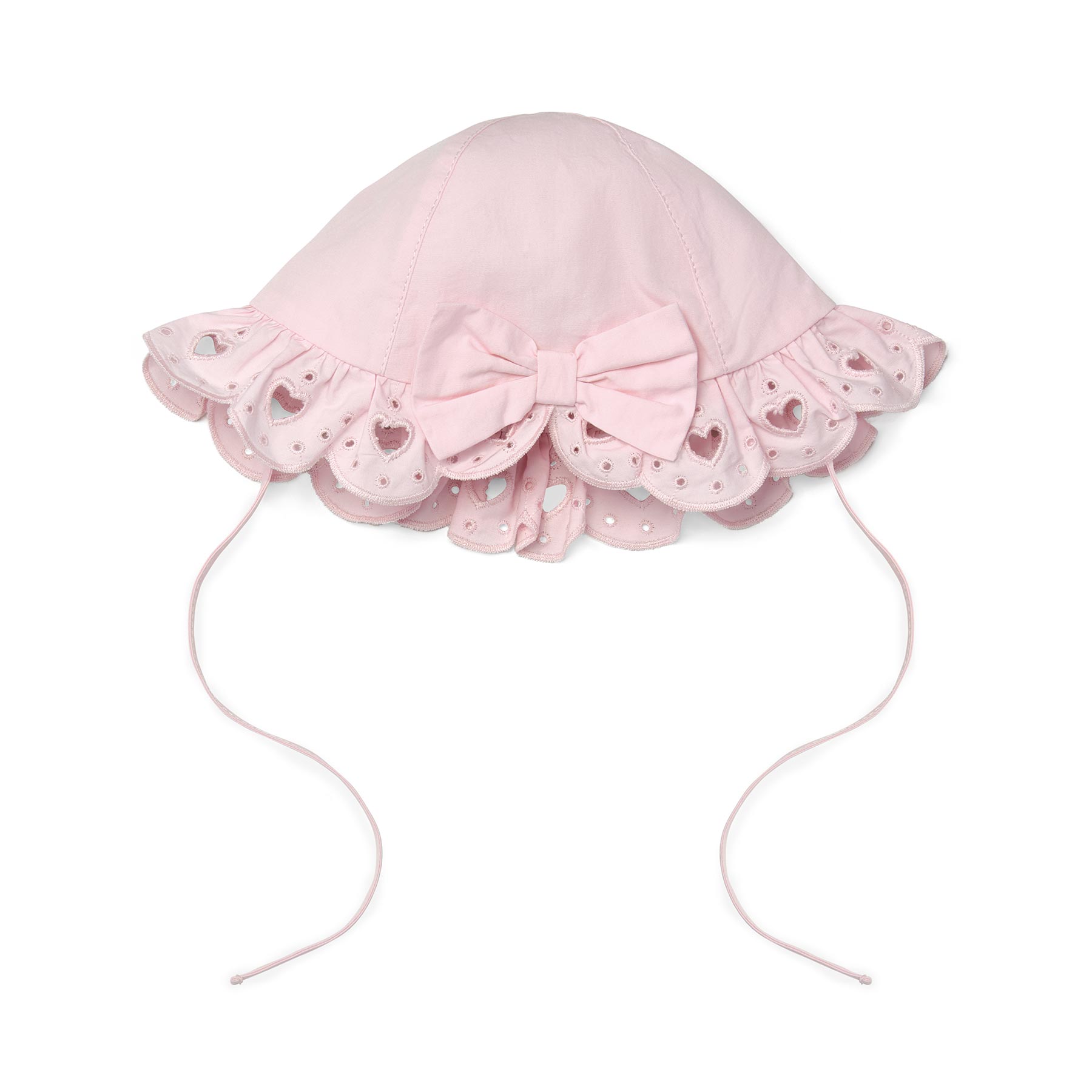 Little A Olsen broderie anglaise sunhat with frill detailing and diamante branding and applique bow on the front.  Perfect for protecting baby's head from the sun.  Wear with any item in the Perfectly Pink collection.
