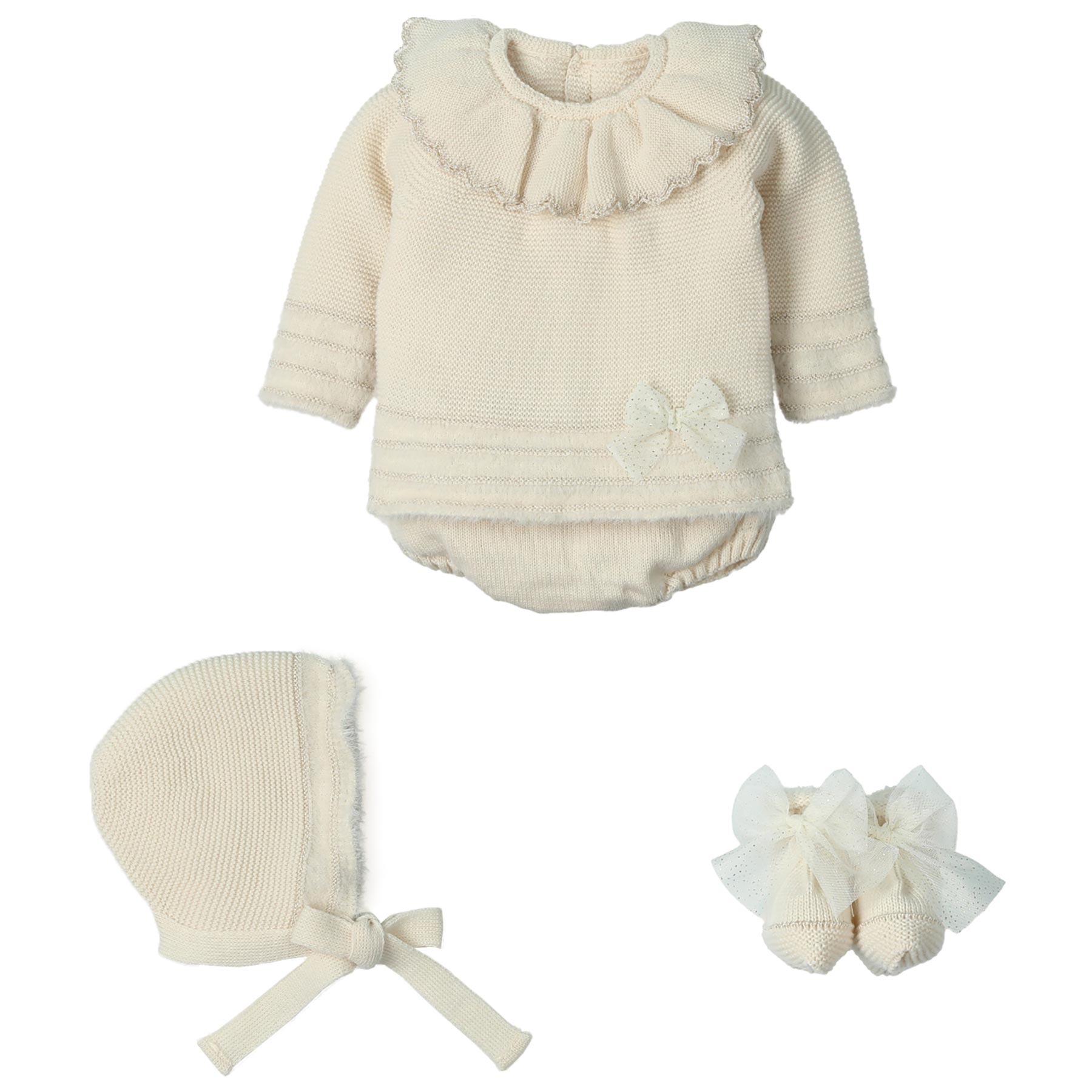 Mac Ilusion Baby - knitted collection - 4 piece jampant set - stunning pearl knit girls sweater with wide knitted collar with gold scallop edge and fluffy knit panels on the cuffs and hem - with fixed gold polka tulle bow, pearl buttons up the back - comes with jampant bottoms and bonnet with fluffy knit edge. Included in this set are knitted booties with a fluffy knit rolled edge and gold polka tulle thread and bow. A truely stunning set which is also available in ivory. Perfect outfit for any occasion. Sizing is good for the age in this item. Made in Spain - easy to wear and comfortable. Other matching items in this collection. Makes a fabulous New Baby or Baby Shower gift. Matching blanket available.