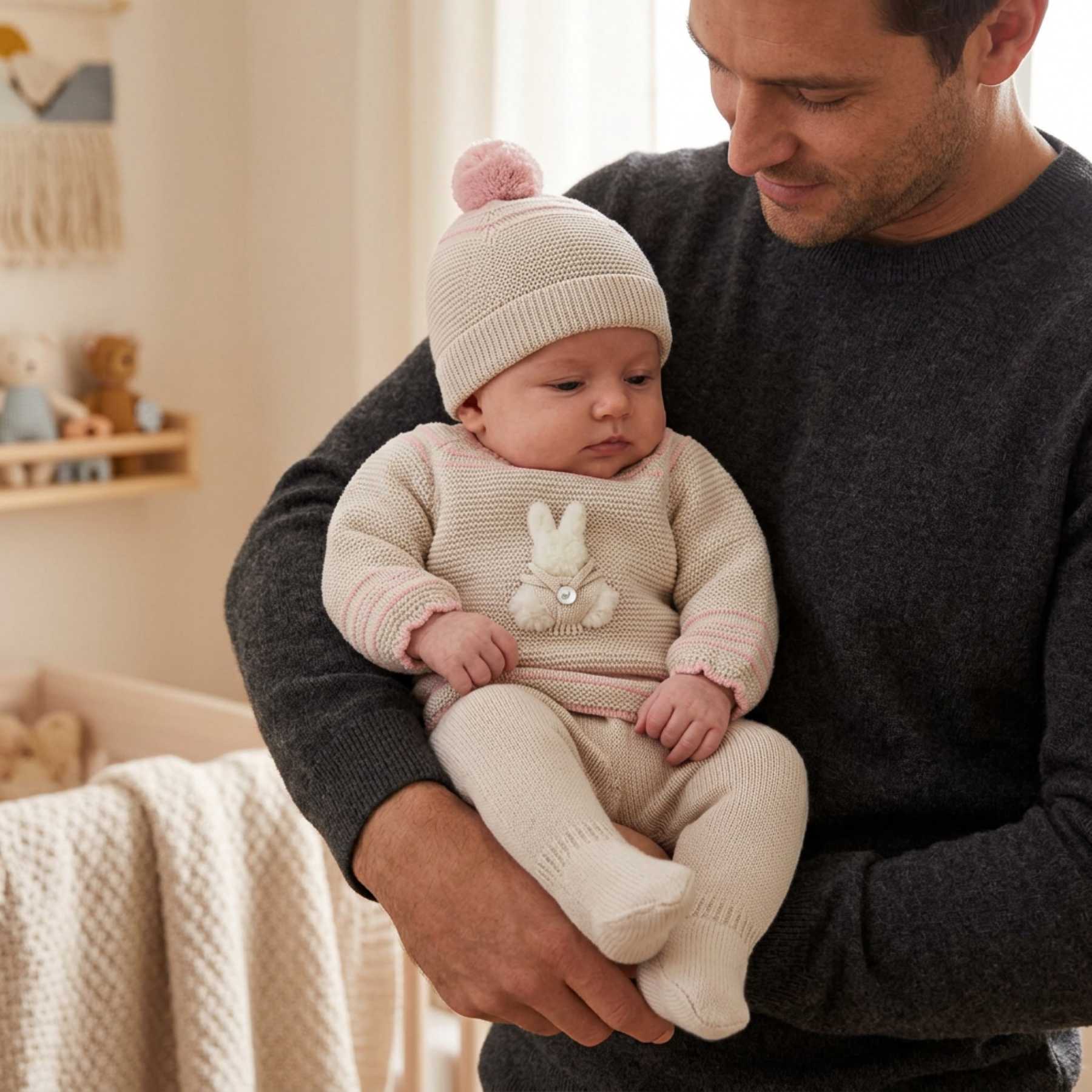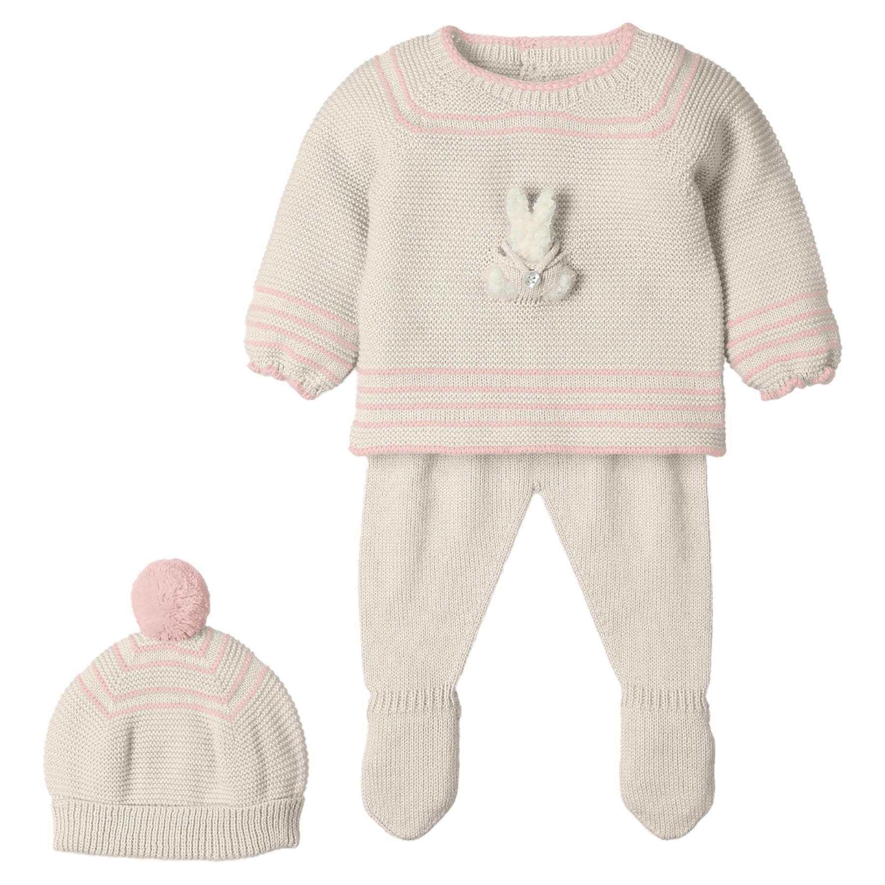 Mac Ilusion Baby - Knitted collection - gorgeous winter knit baby sweater, feet in leggings and hat with contrasting pom pom - cute rabbit applique on the front of the sweater. A perfect baby gift - there is a matching blanket/shawl also available. Sizing is good for the age in this set. Made in Spain - easy to wear and comfortable. A perfect baby gift which is presented in a MacIlusion box. Available in sizes 00 premature to 6 months.