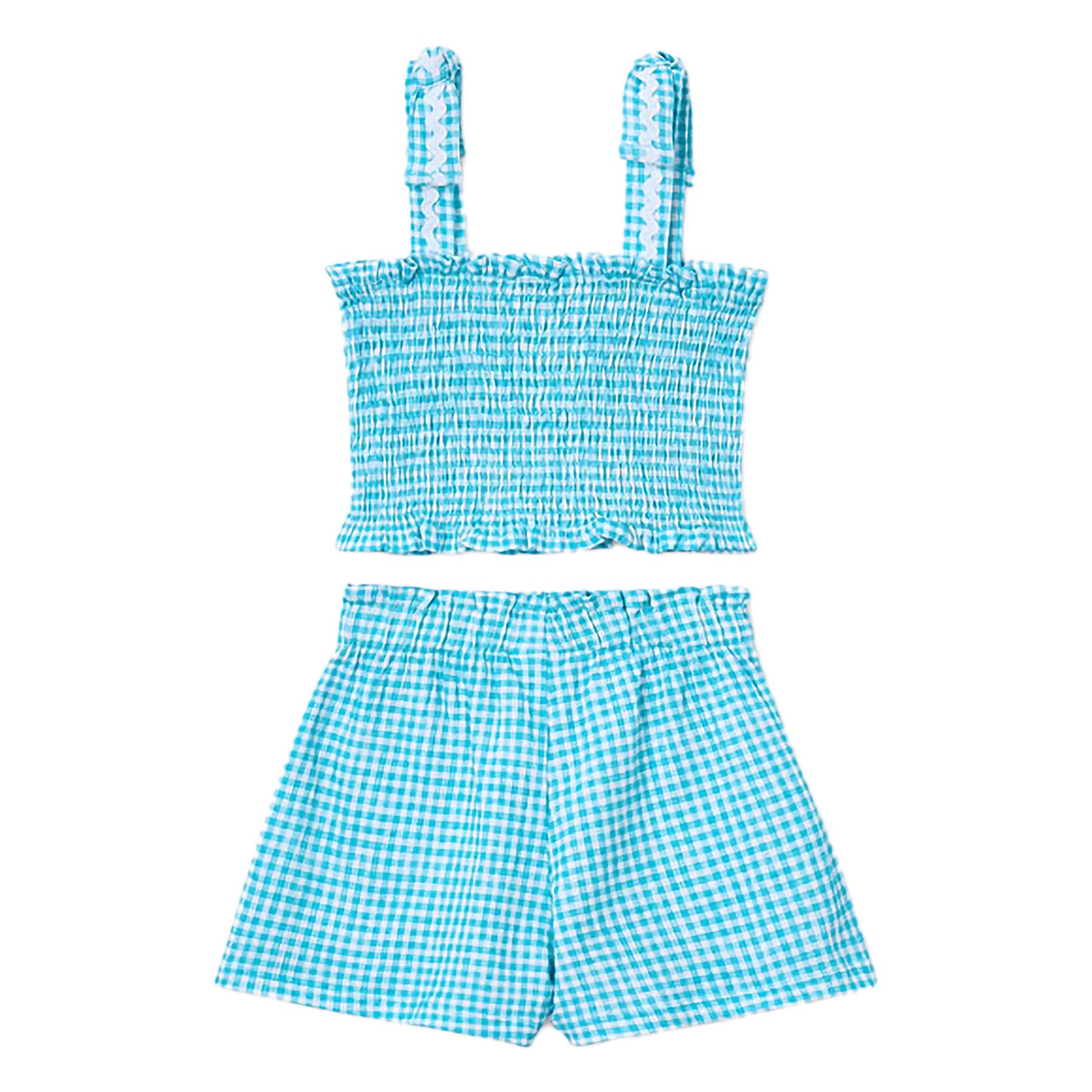Mayoral Girls Summer Elastic Smock Gingham Top & Shorts Set X 2 - Blue