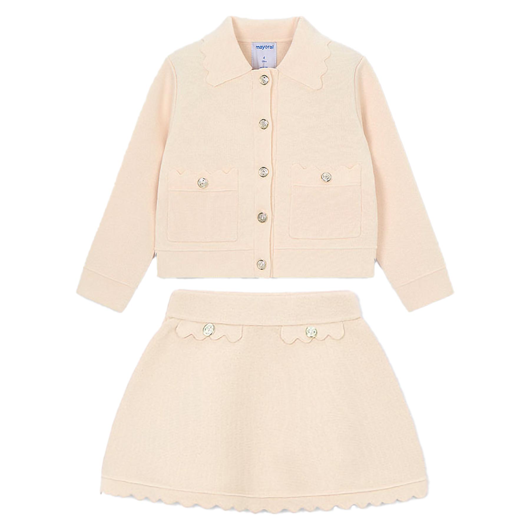 Mayoral Girls Summer collection knit jacket & skirt set x 2. Beautiful summer knit jacket with scallop edge and gold button details with matching knit skirt with scallop hem, elasticated waistband and gold button details on the front. Easy to fit and comfortable. Both Jacket & skirt can be worn seperately with other items in this collection. Perfect little sister/big sister wear anytime outfits.