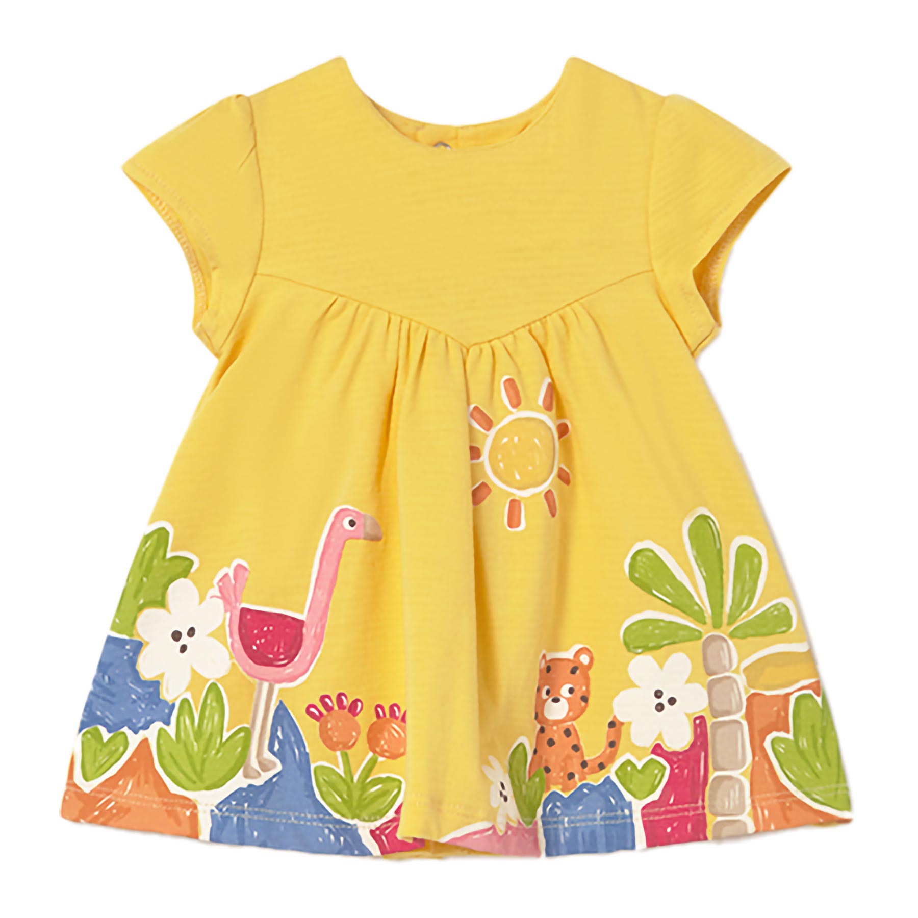 Mayoral Newborn Girls pretty sundress.  Short sleeve sundress with fun print front and with poppers at the back - an easy to wear dress - perfect for covering over swimwear and wearing for summer holidays. Other matching items available in this theme.