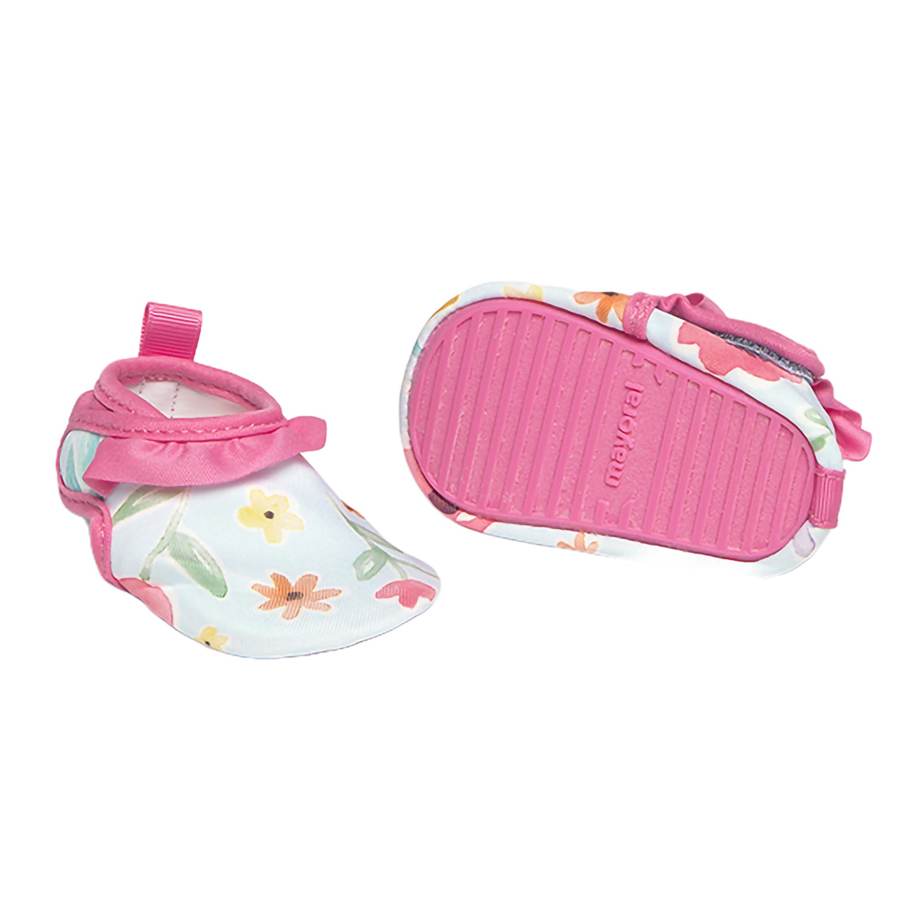 Mayoral Newborn Girls floral print lycra booties.  Lycra booties which are easy to fit - perfect for the beach and holidays - wear with our matching swim set or rashguard set in the same floral print. Other matching items available in this theme.