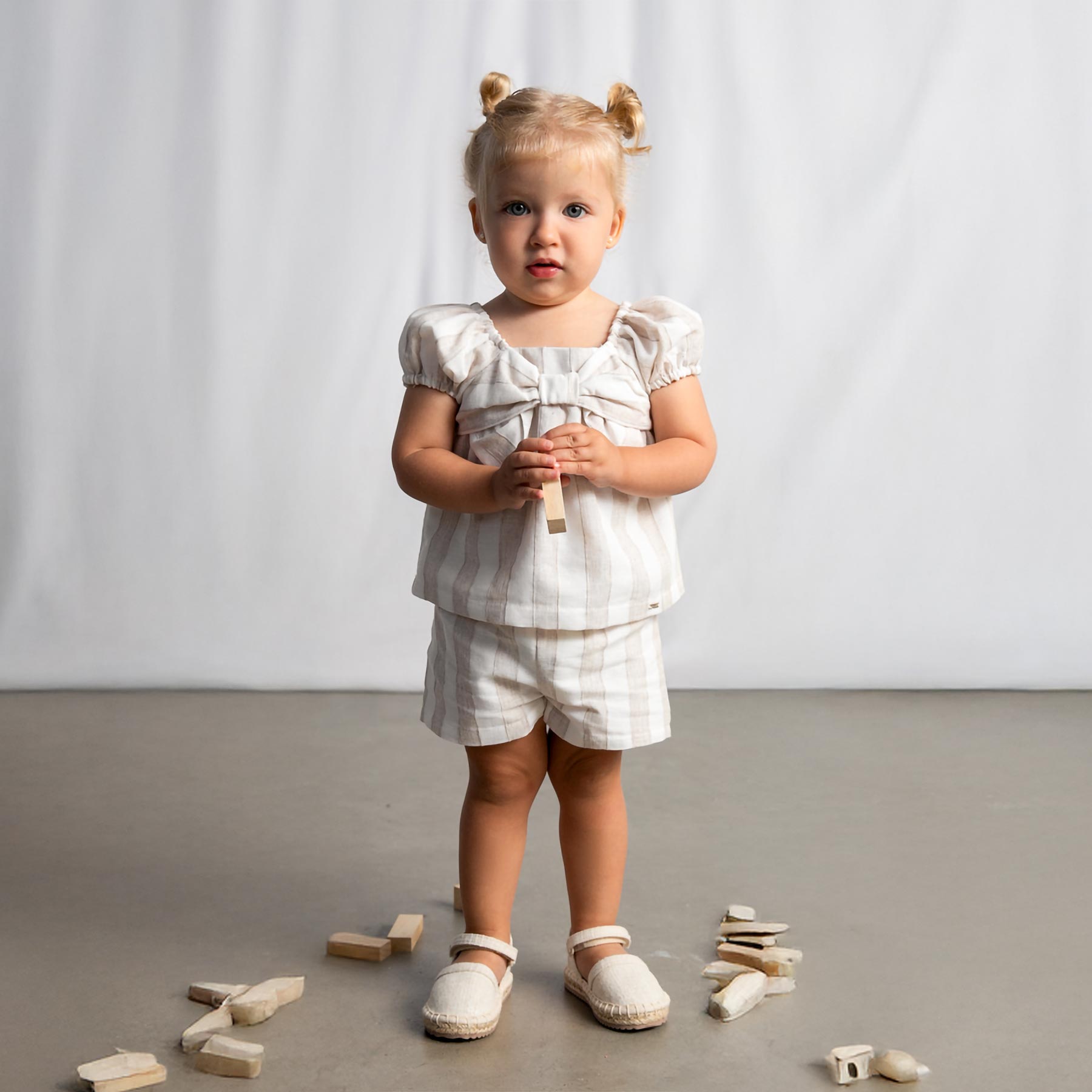 Mayoral Toddler Girls Summer collection. Pretty poly cotton blouse in a stylish wide stripe with elasticated neckline and sleeves with large fixed bow on the bodice. Full body and lined - comes with matching lined shorts with elasticated waistband. Easy to wear and care for. Perfect little sister/big sister holiday outfits.