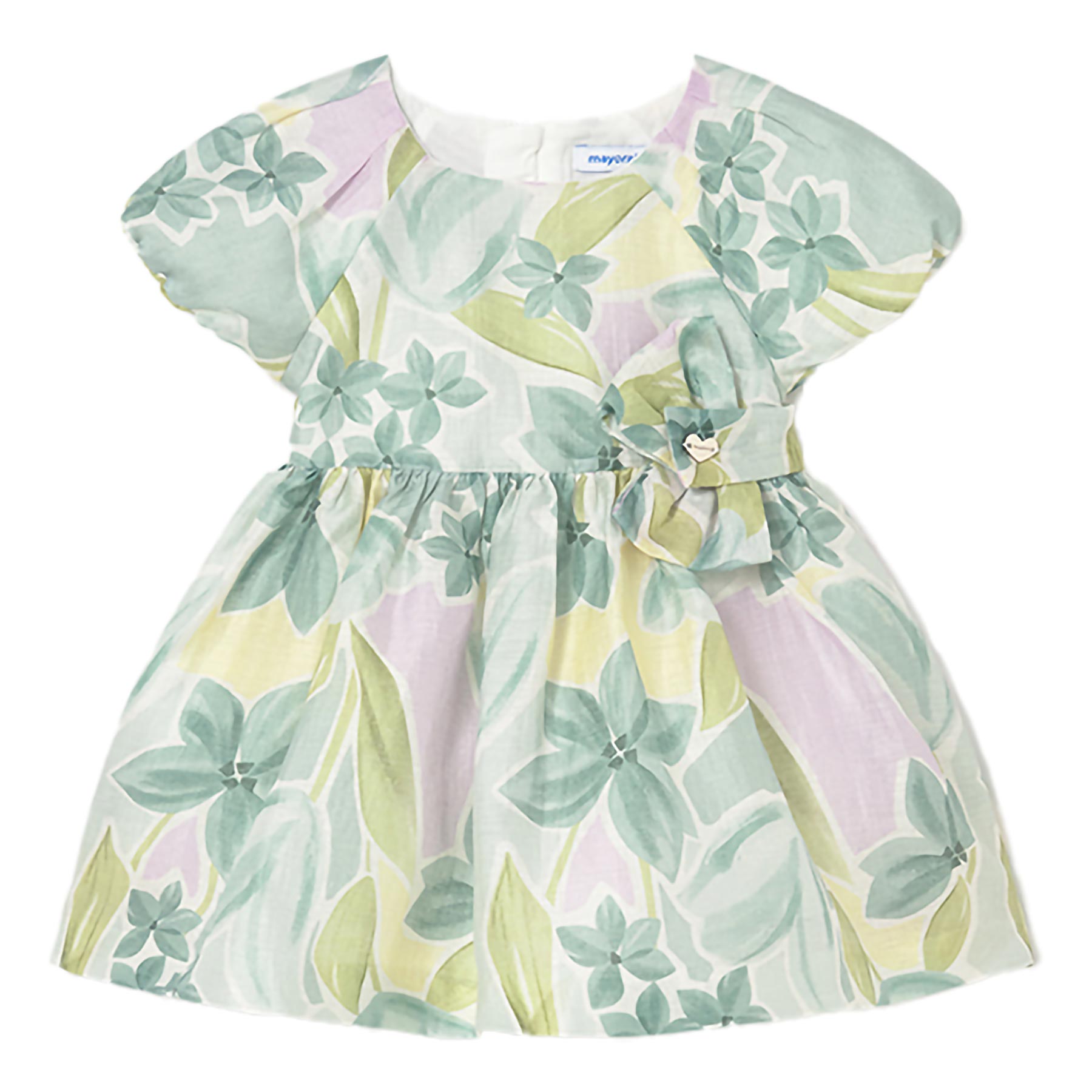 Mayoral Toddler Girls Summer collection. Pretty linen cotton party dress with vibrant all over print and large fixed bow on the front of the waist with heart charm. Puff sleeves, lined with petticoat and concealed zip at the back. Perfect for summer parties and holidays. Easy to wear and care for. Perfect little sister/big sister holiday outfits. Available in other colours. Older sister version also available.