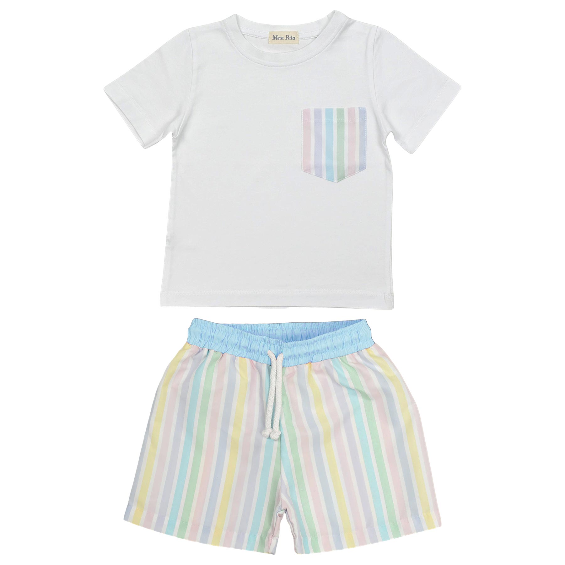 Meia Pata Boys Summer 2026 collection - Stripes Colour boy's short sleeve cotton t-shirt & Swim Shorts set x 2. Stylish white cotton jersey loose fitting t-shirt featuring a stripes print pocket on the chest with matching Stripes print swim shorts with elasticated waistband with pull tie and back pocket. Other matching items available including towel.