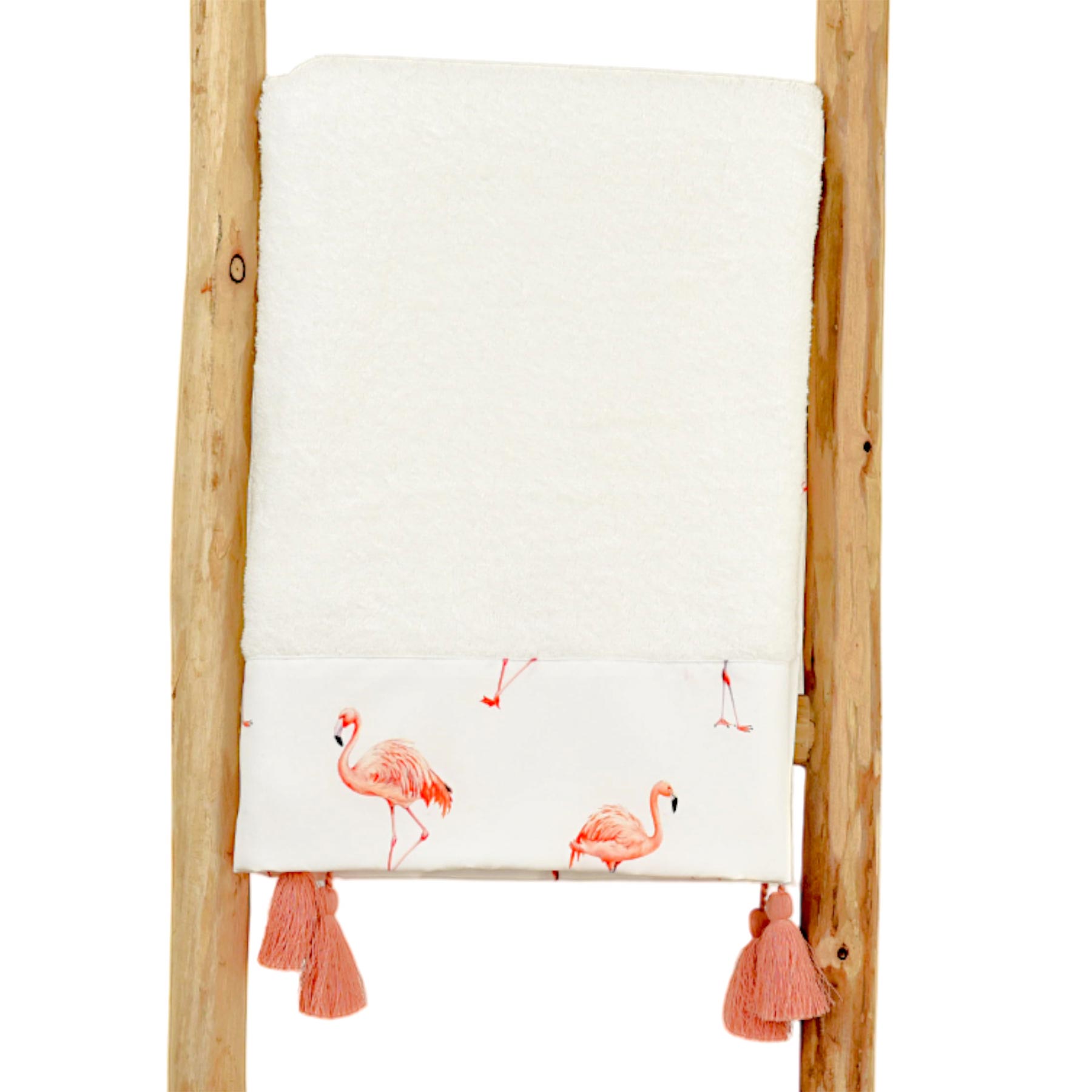 Meia Pata Beach Towel in soft white terry towelling with Flamingos print panel at each end with matching tassels. Essential towel for drying off wet children or for protecting them from hot sand and pebbles.