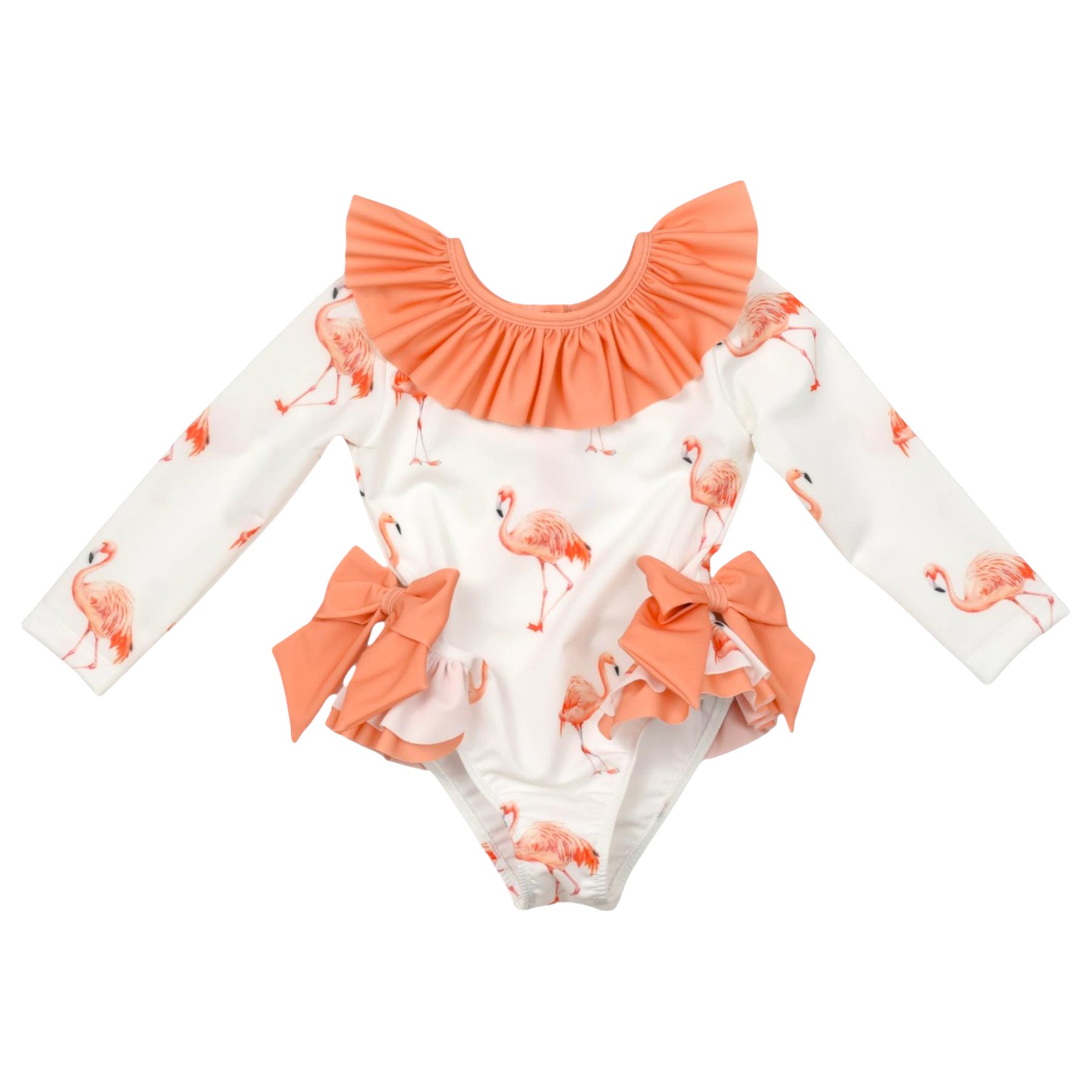 Meia Pata Girls Summer 2026 collection - Jamaica long sleeve Swimsuit. Beautiful swimsuit featuring a vibrant Flamingo print. There is a single ruffle around the neckline with 3 poppers at the back of the neck, double ruffles on the hips with large fixed bows .  Fully lined.  Matching sibling swimwear available as well as pool slippers, sunhat and towel.
