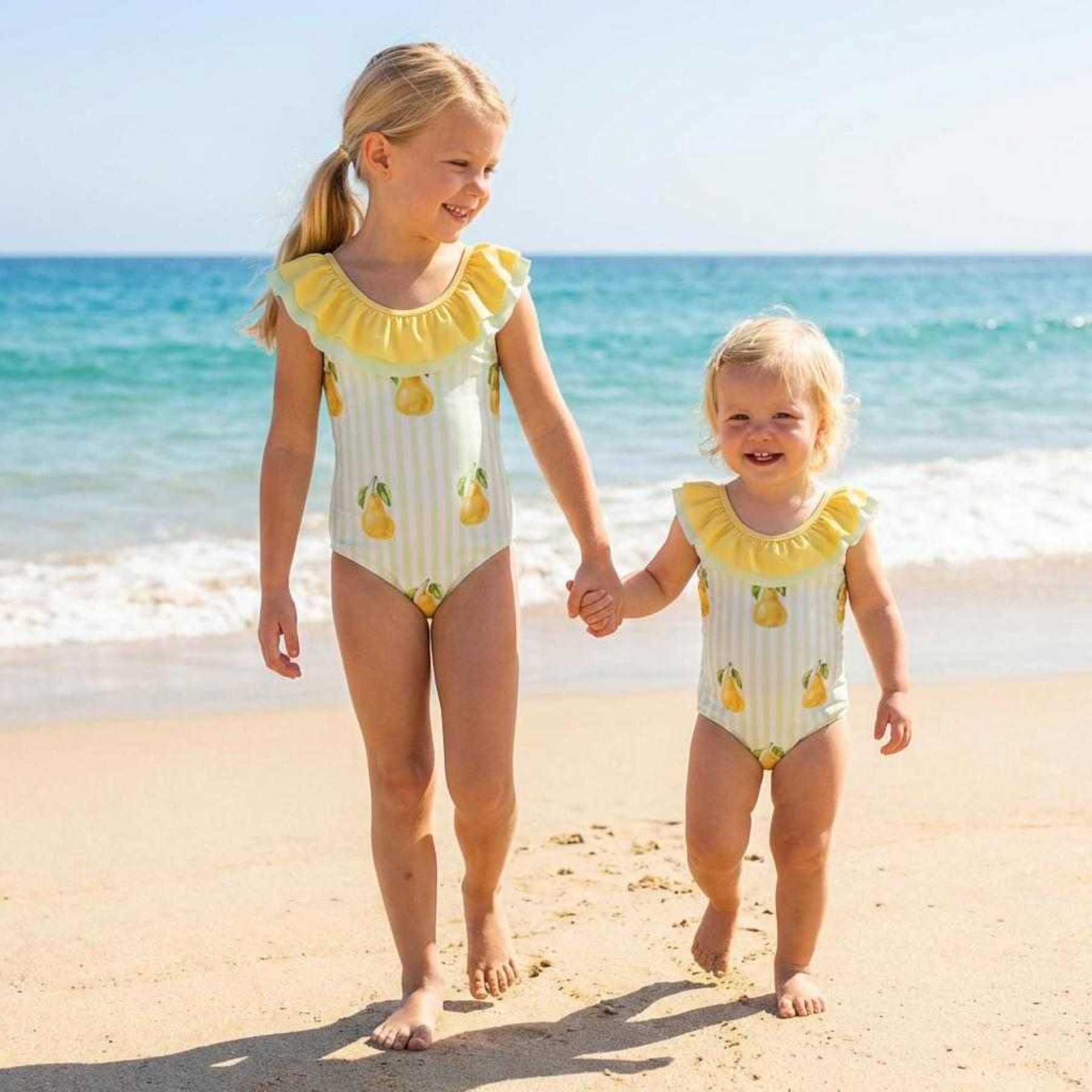 Meia Pata Girls Summer 2026 collection - Cayo Coco Swimsuit. Beautiful swimsuit featuring a pretty pears print. There are contrasting lemon and green ruffles around the neckline, double ruffle straps at the back finished with a large fixed bow.  Fully lined.  Matching sibling swimwear available as well as pool slippers, sunhat and towel.