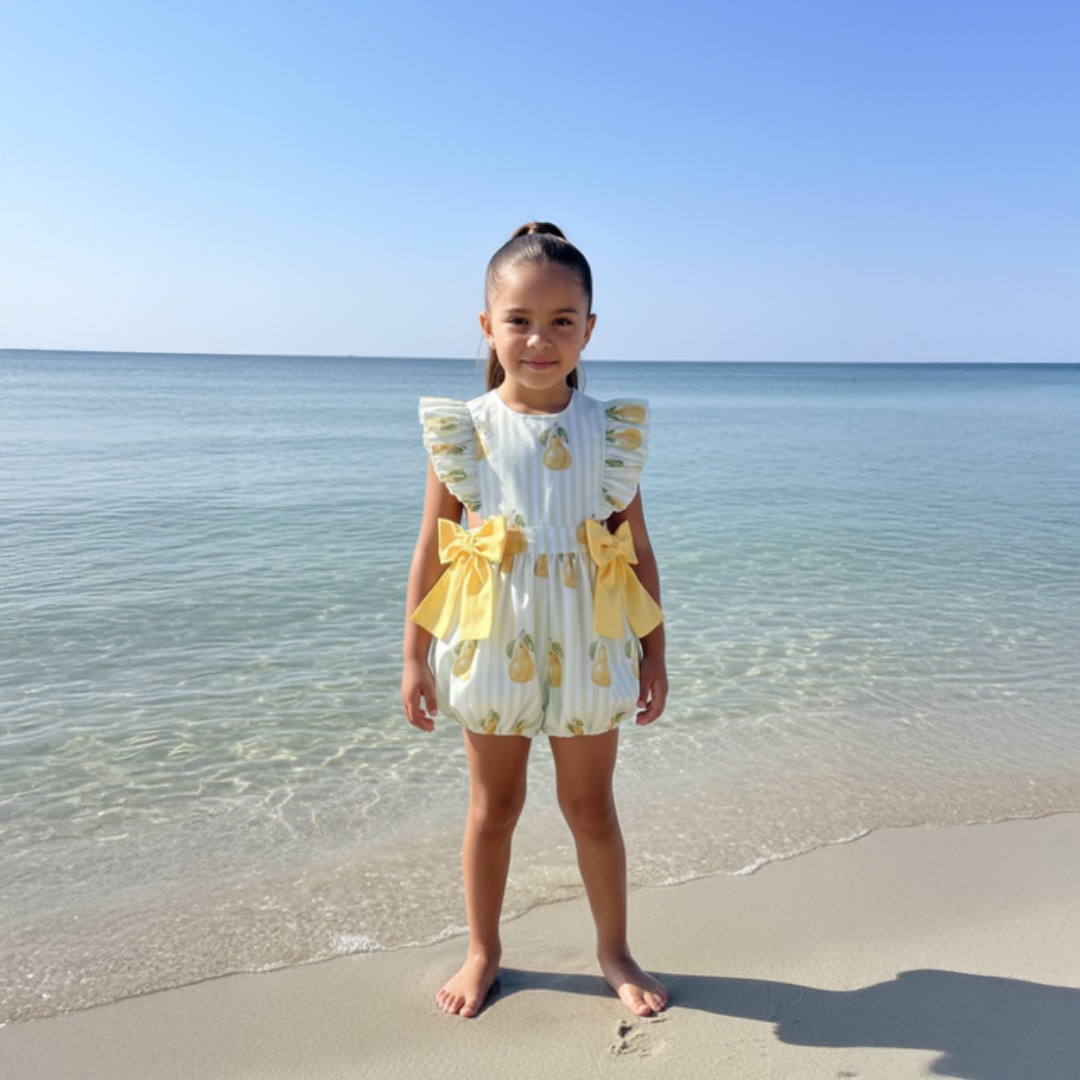 Meia Pata Girls Summer 2026 collection - Pear print ruffle sleeve jumpsuit. Beautiful jumpsuit featuring a pretty pears print ruffle over the shoulders, with baggy bloomer bottoms and extra large fixed bows in lemon on the hips - with pearl buttons up the back for easy fitting.  Elasticated legs.  Matching swimwear available as well as pool slippers, sunhat and towel.