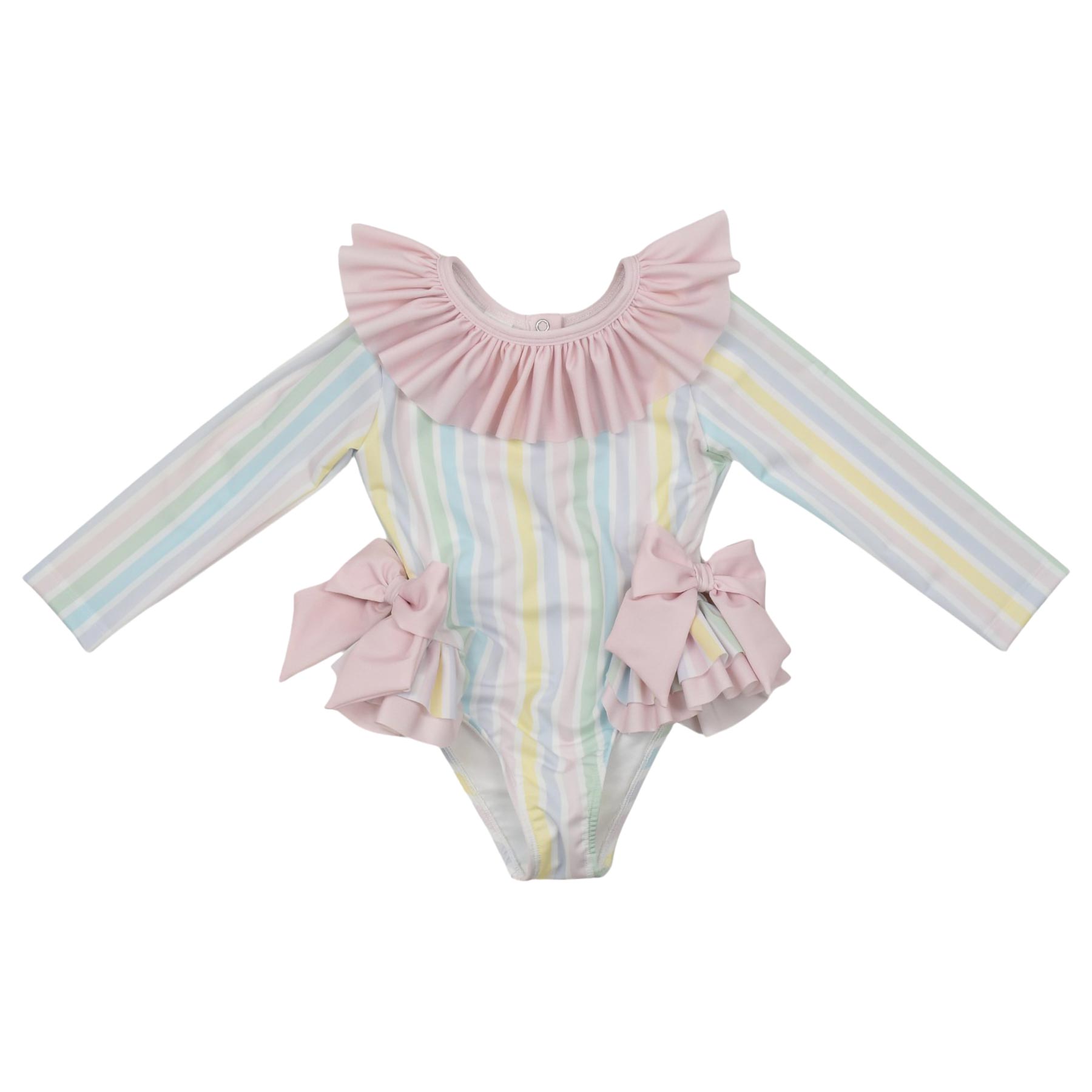Meia Pata Girls Summer 2026 collection - Jamaica long sleeve Swimsuit. Beautiful swimsuit featuring a pretty stripes colour print. There is a single pink ruffle around the neckline with 3 poppers at the back of the neck, double ruffles on the hips with large fixed bows .  Fully lined.  Matching sibling swimwear available as well as pool slippers, sunhat and towel.