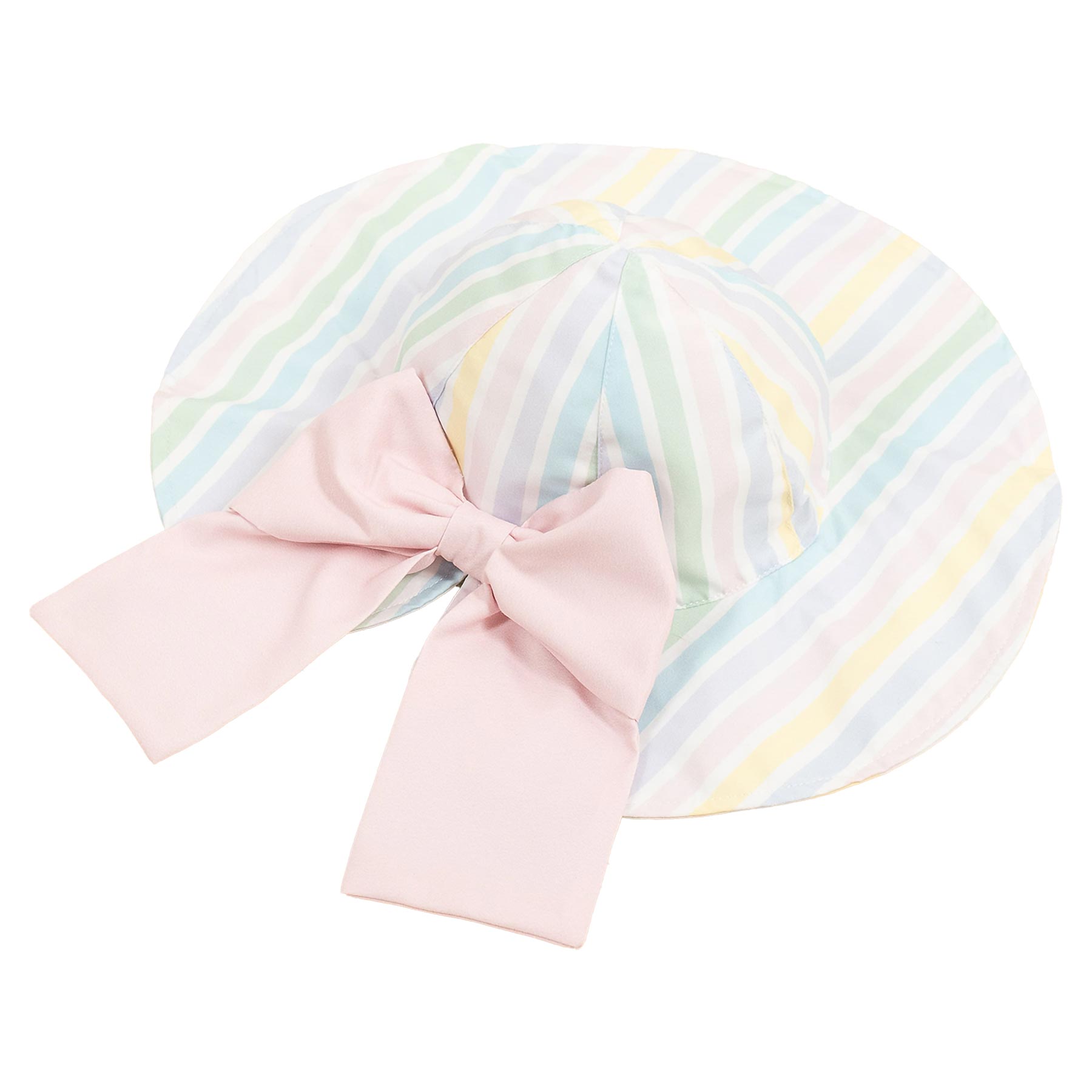Meia Pata Girls Summer 2026 collection - Girl's Sunny hat in Stripes print. Stylish - easy to wear -  double thickness poplin cotton hat with Stripes print all over and large fixed bow in pink at the back of the head.  Matches the Stripes Colour Collection perfectly.   Perfect for protecting heads against the sun.