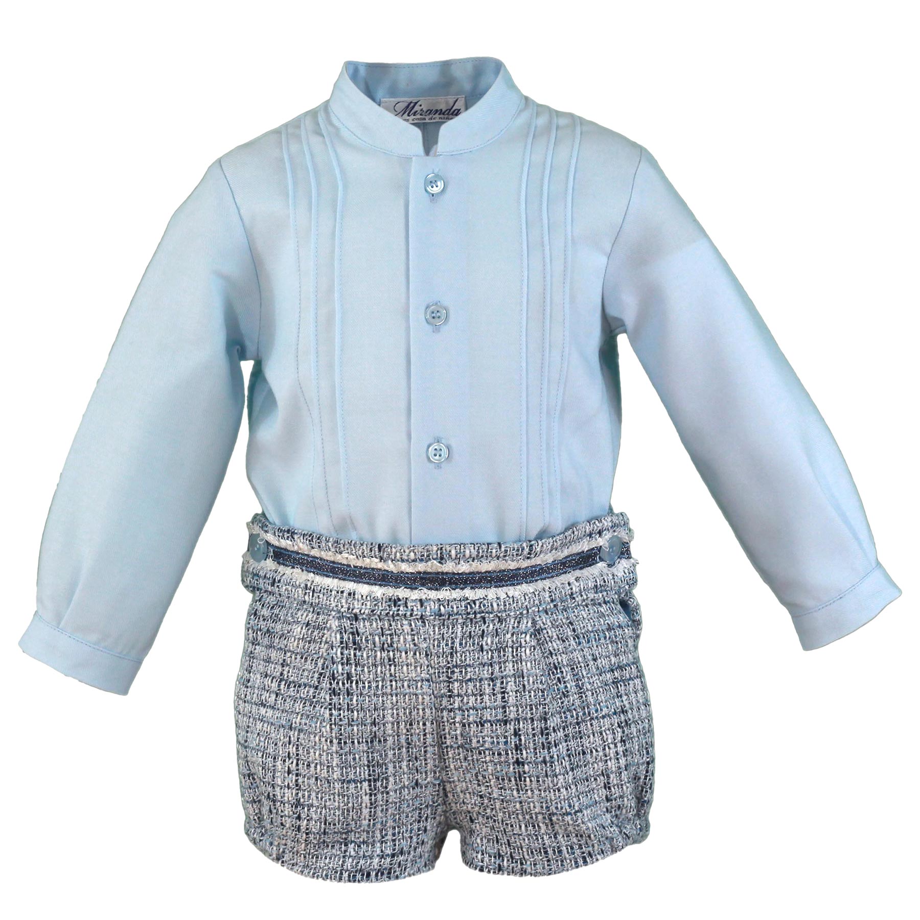 Miranda baby boys stylish blouse and pants set with side button trim waist band - traditional neckline and long sleeves shirt with front pleats and buttons - cuffs with buttons. Woven pants with half elasticated legs and lined with soft cotton.  The perfect christening, wedding and special occasion outfit.