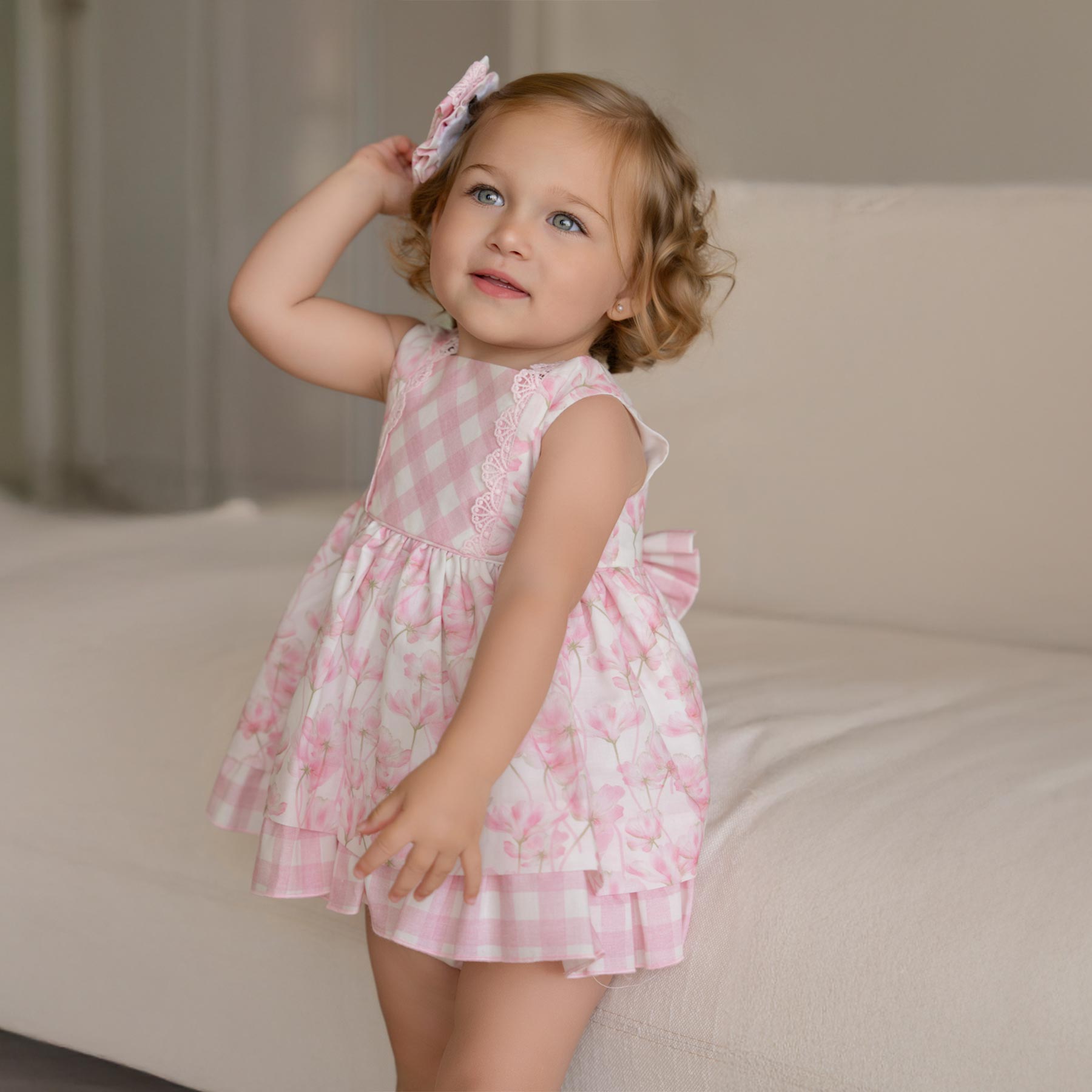 Miranda baby girls stylish check and floral ruffle dress featuring scallop lace trims and large fixed bow at the back.  Lined with a petticoat.  Set includes matching check panties. Other matching items available. The perfect baby sister / little sister dress set x 2.