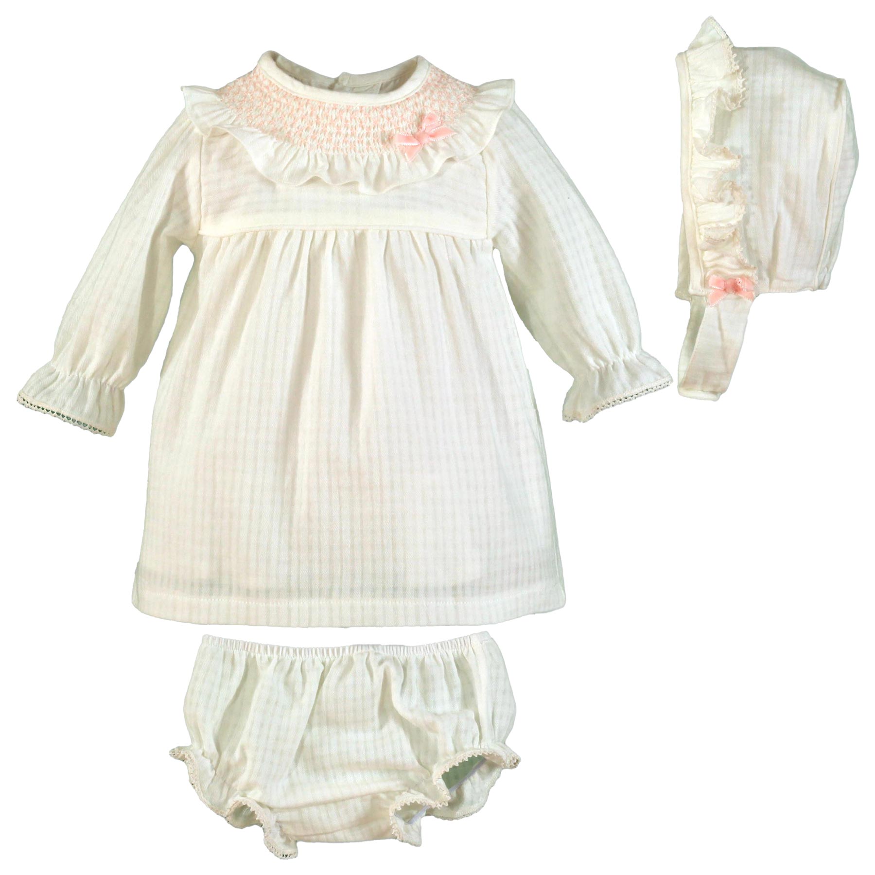 Miranda baby girls stylish dress, pants and bonnet set with smocked bodice with frill and pink velvet bow - long sleeves with ruffle cuffs - this set includes matching bonnet with frill and panties. Buttons up the back. Pants have an elasticated waistband and lined with soft cotton. Matching bonnet with frill and velvet bow in pink.