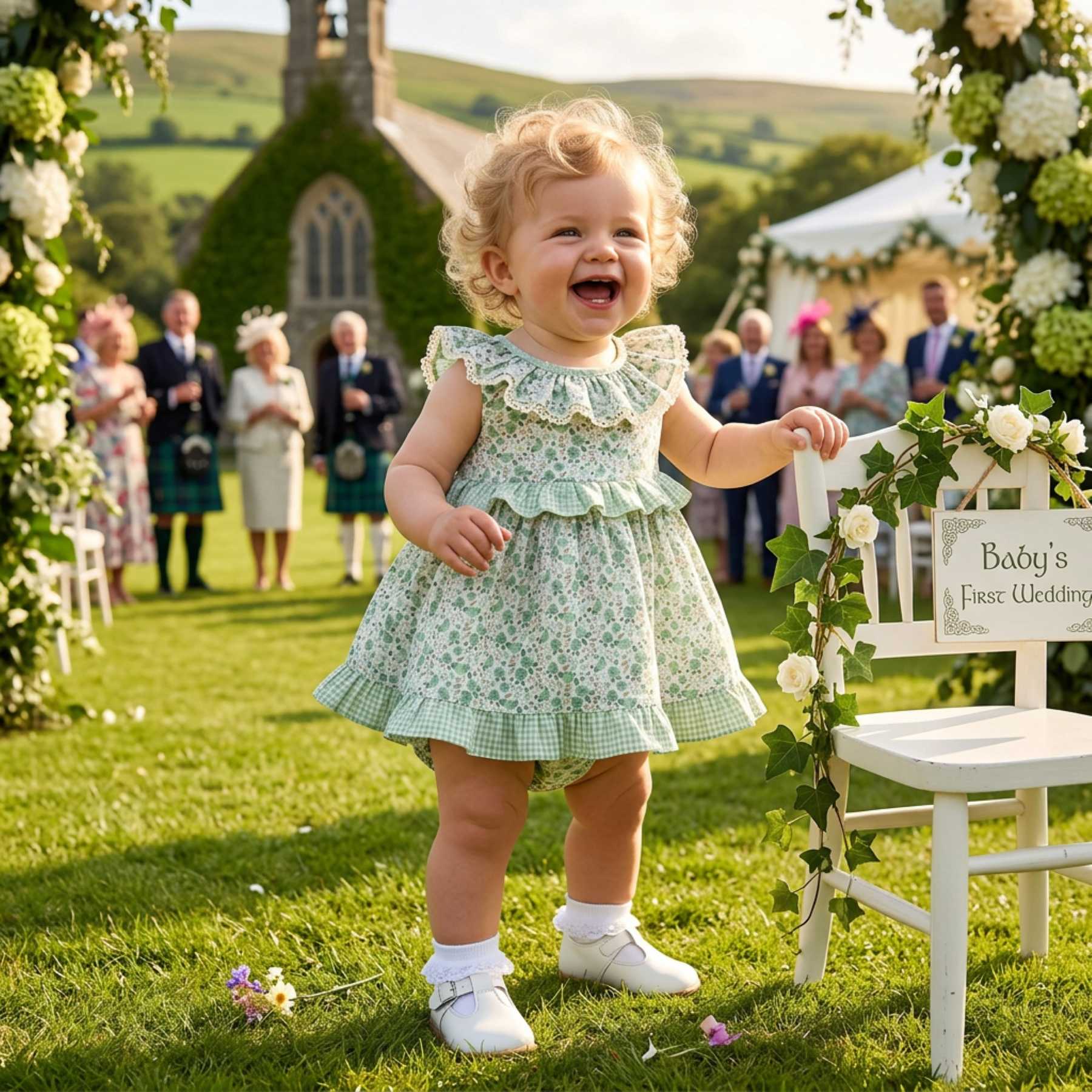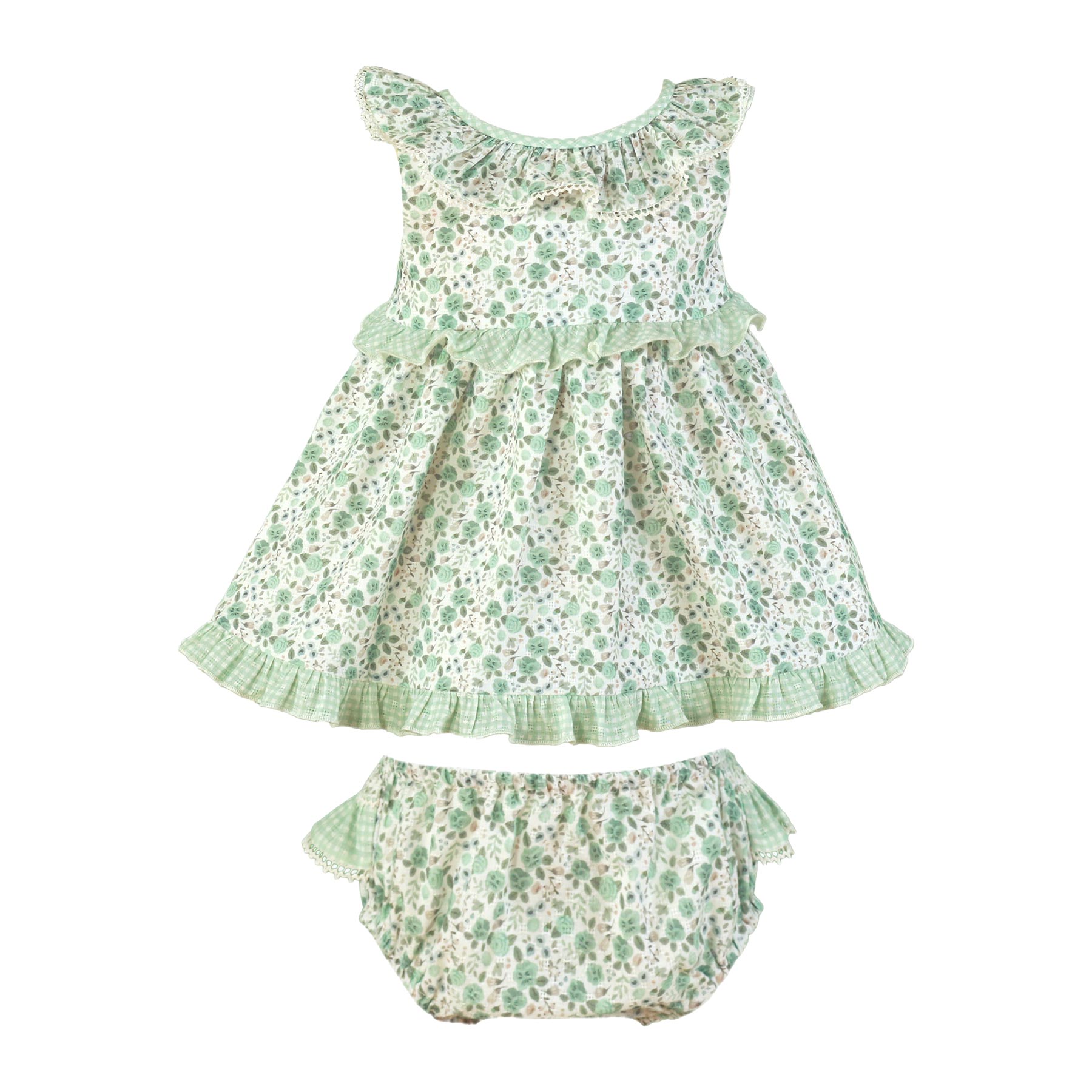 Miranda baby girls stylish floral and gingham dress & panties set featuring a ruffle collar and hem with poppers at the back. This dress has a lovely ruffle trimmed opening at the back, trimmed with fixed bow. Set includes matching floral panties. Other matching items available. The perfect baby sister / little sister ruffle dress & panties set x 2.