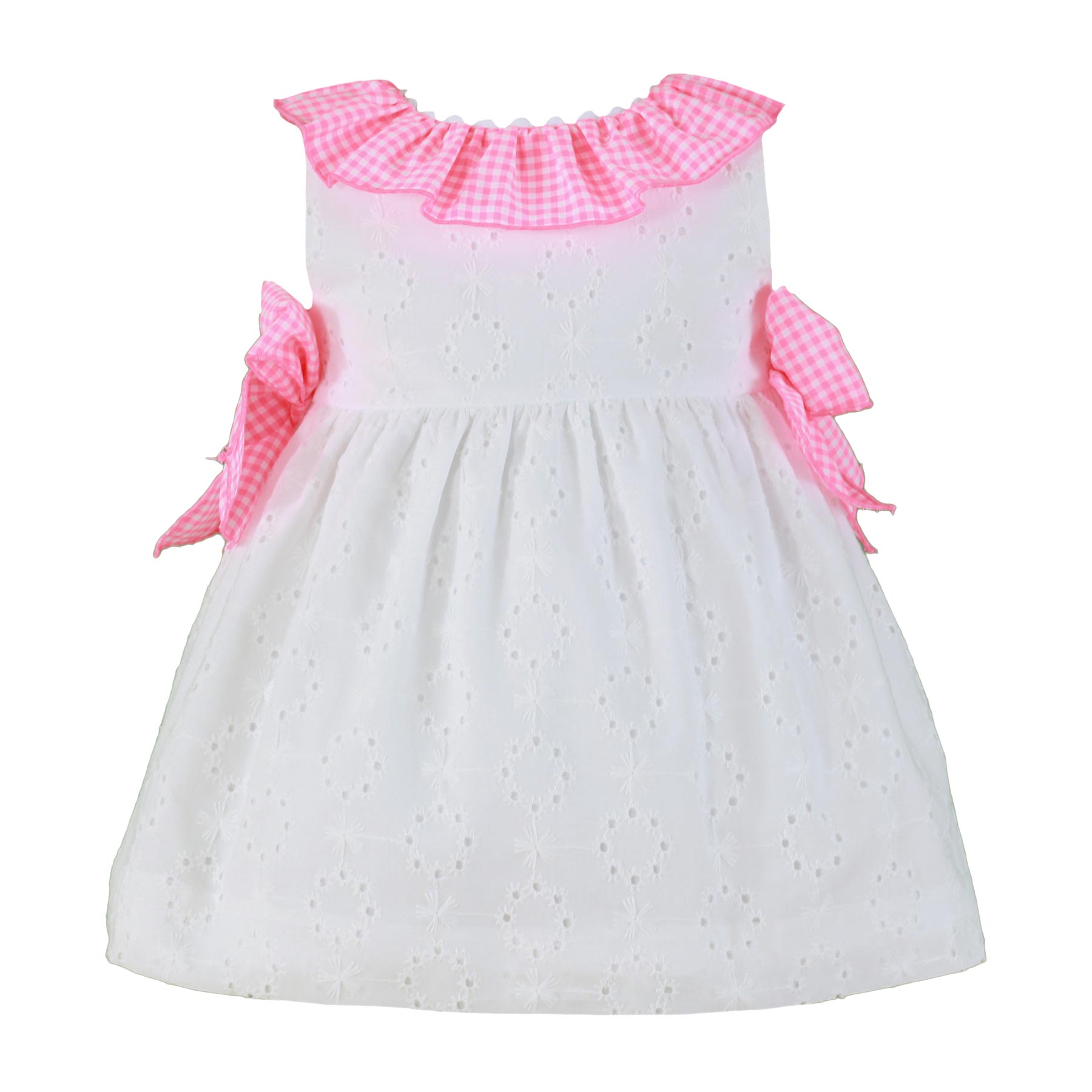 Miranda baby girls pretty white lace sleeveless dress with pink gingham ruffle collar and fixed bows at the side.  With buttons up the back. Other matching items available. The perfect baby sister / little sister dress.