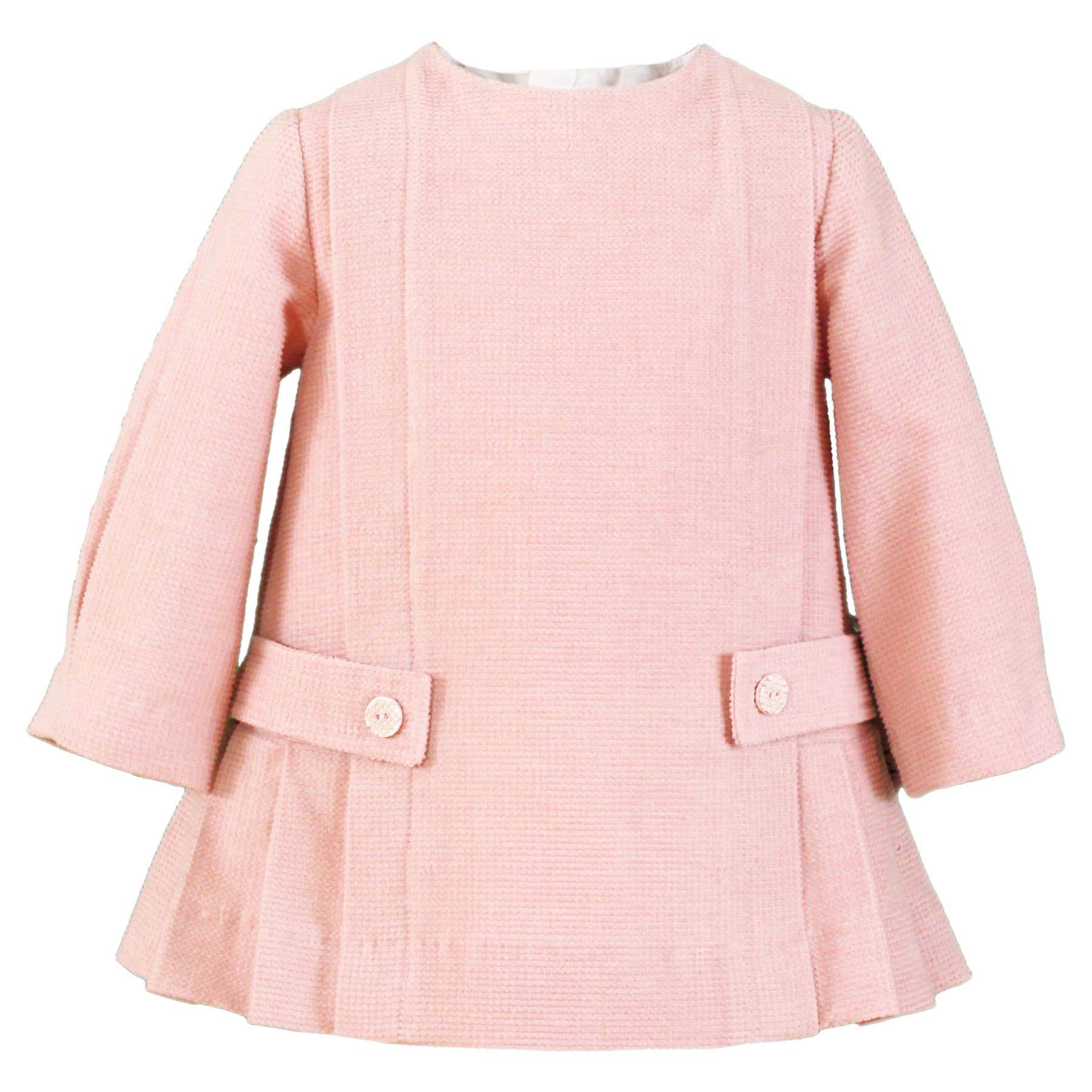 Miranda baby girls stylish dress with long sleeves and pleated skirt - plain neckline and blet and button details on the hips - concealed zip at the back and lined with cotton petticoat. One piece dress that is easy to wear.  The perfect little sister / big sister dress.