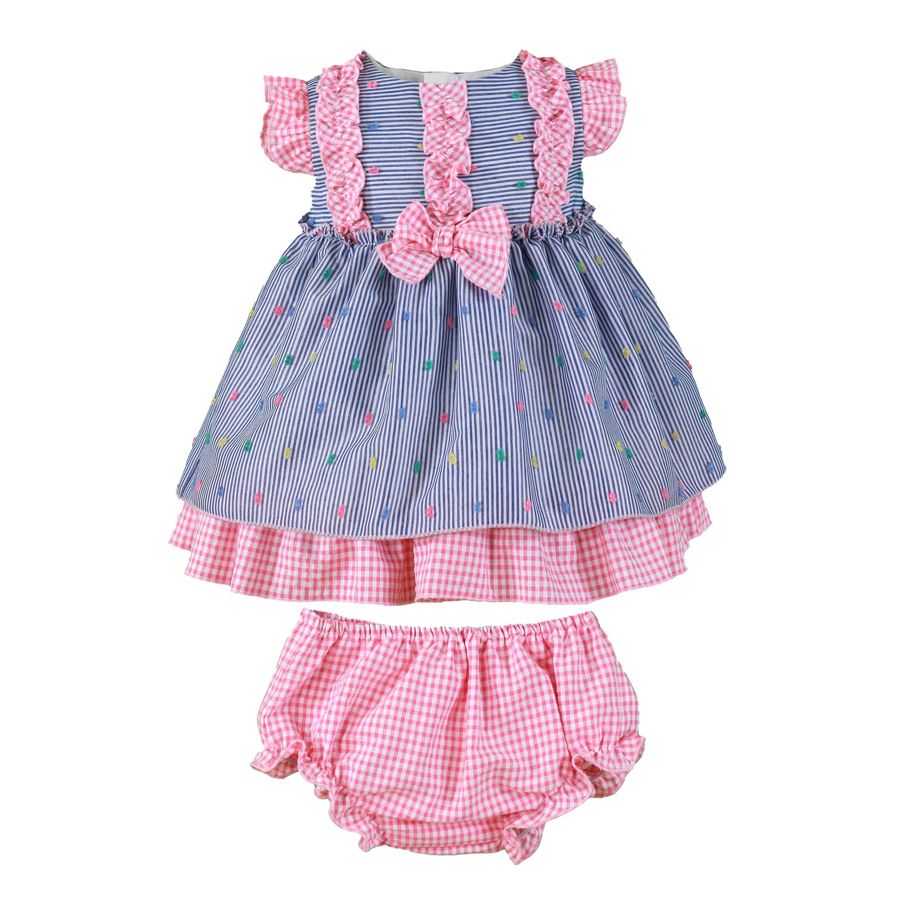 Miranda baby girls gorgeous multi coloured plumetti cotton blue stripe dress featuring a ruffle gingham sleeve and ruffles on the bodice with a fixed bow on the front and a full skirt with a pink gingham hem.  Lined with a petticoat. Set includes matching pink gingham panties. Other matching items available. The perfect baby sister / little sister dress set x 2.