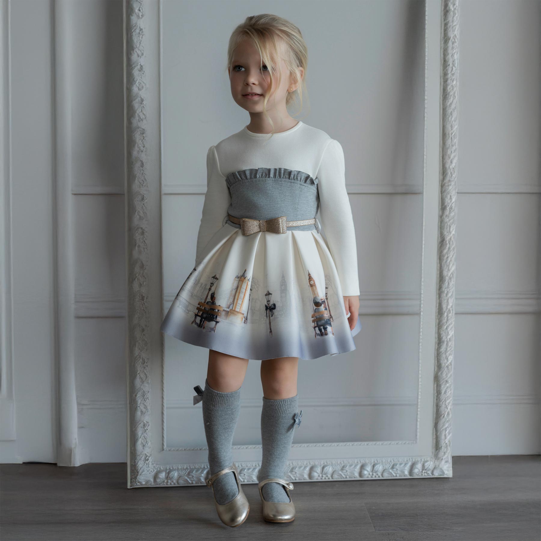 Miranda girls gorgeous dress with London graphics on the full skirt, which has a pretty detachable gold glitter belt, ivory sleeves and shoulders and grey bodice with frills - concealed zip at the back and lined with petticoat.  A stunning dress on.  The perfect little sister / big sister outfit.