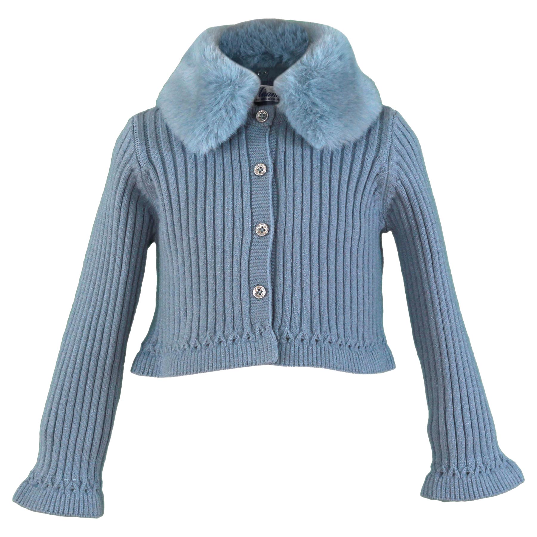 Miranda Girls Ribbed Cardigan With Faux Fur Collar - Blue
