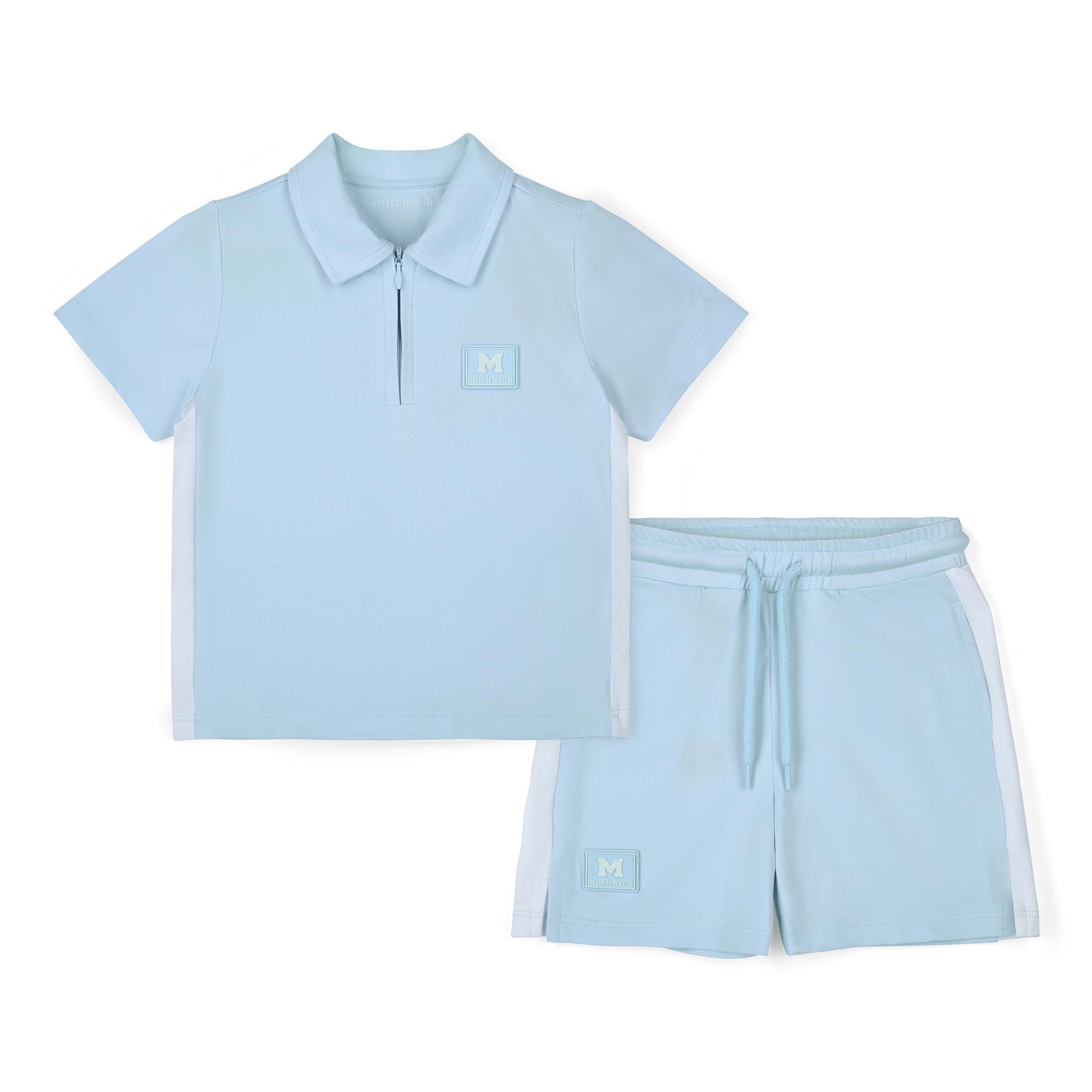 Mitch & Son Boys Blue Breeze Collection  - The Osiris short sleeve top and matching shorts, made from a soft poly jersey fabric for comfort and movement.  Finished with a logo badge on the front and with zip detail.  Perfect travelling outfit.  Easy to wear and comfortable.  Wear with other items from this collection.  Perfect little brother/big brother outfit for summer.