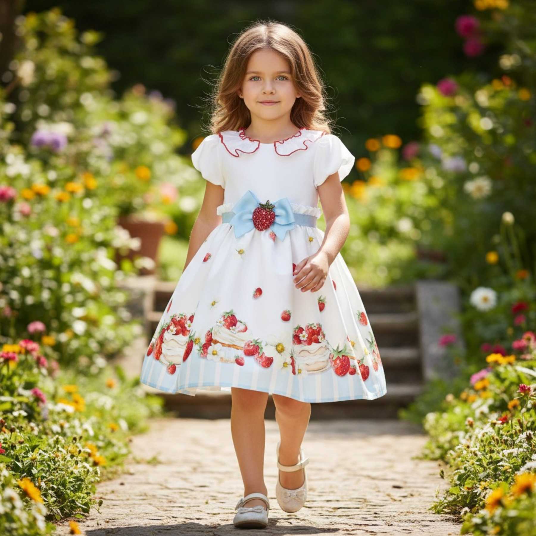 Monnalisa Bebe Girls Disney Pooh Bear dress. This classic-style Monnalisa dress with pretty all over strawberry print on the skirt and Monnalisa logo print - pretty ruffle collar with red edge and blue bow waistband with strawberry applique is a timeless piece for your little one's wardrobe. Perfect for special occasions or everyday wear, this dress combines style, comfort, and quality in one adorable package.