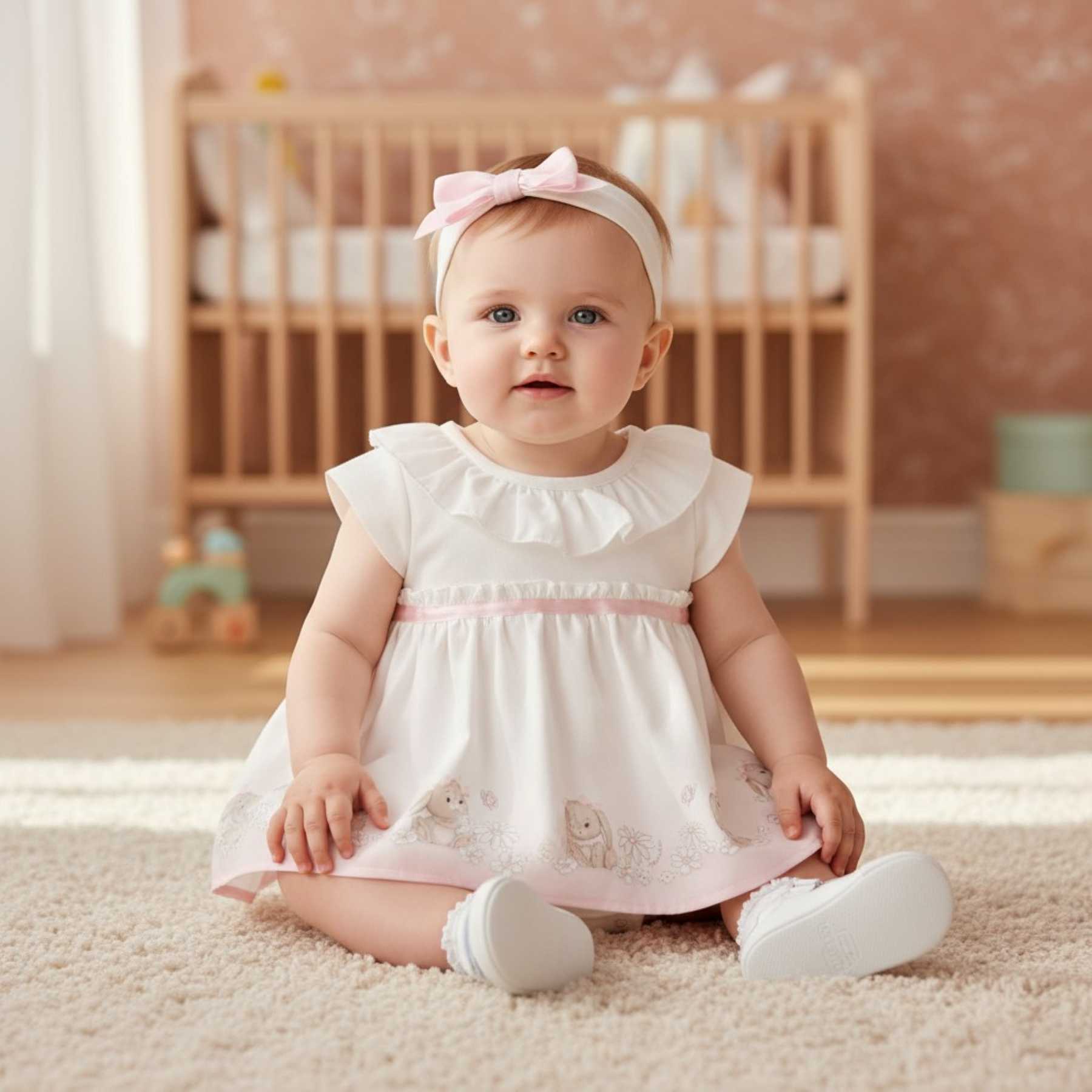 Monnalisa Bebe Girls Romantic Bunny skirted romper dress with matching headband. This charming short-sleeved poplin and jersey cotton romper dress is a must-have for your little one’s wardrobe. Crafted from soft, breathable cotton, it ensures ultimate comfort. Pretty Monnalisa romantic bunny print all over the skirt hem, with pink ribbon around the waist. Pretty ruffle collar and Monnalisa logo. Poppers up the back and between the legs. The convenient popper fastening up the back and between the legs makes dressing your baby a breeze.