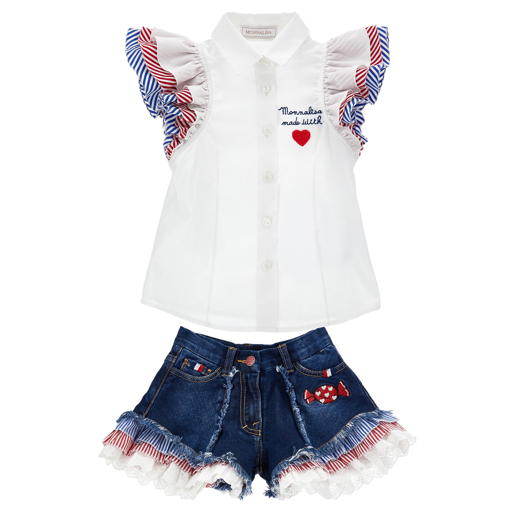Monnalisa Girls stunning double ruffle short sleeve poplin cotton blouse with collar and front buttons - comes with fabulous double ruffle leg dark denim shorts with Hello Kitty embroidery. A lovely set which your little one will love - easy to fit and wear - so comfortable. Looks fabulous on all ages 2 - 10 years. Perfect little sister / big sister outfits.