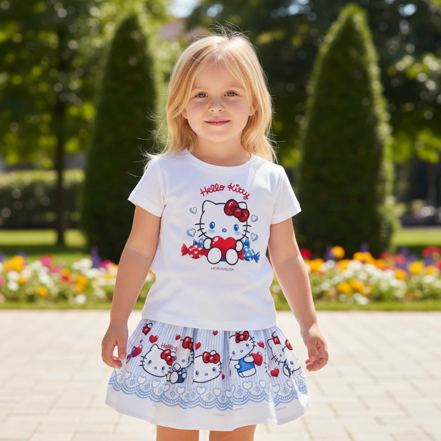 Monnalisa Girls cute short sleeve jersey top with Hello Kitty print with diamante bow on the front - comes with fabulous poplin cotton skirt with elastic logo waistband and Hello Kitty graphics all over. A lovely set which your little one will love - easy to fit and wear - so comfortable. Looks fabulous on all ages 2 - 10 years. Perfect little sister / big sister outfits.
