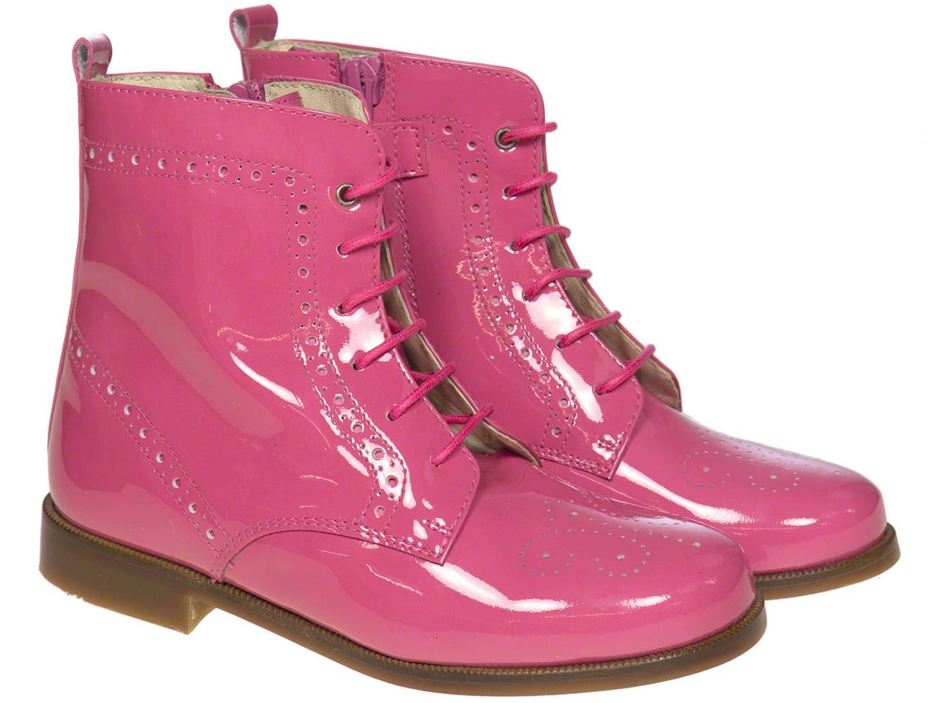 Panache for Kids - NEW Bonnie ankle boot made in fuchsia pink patent leather with Butterfly punch on the toe, brouge punch detail on the sides and heel, with self coloured lace up front which is great for making the boot wider or narrow, inside zip for fast and easy fitting, so no need to unlace the boot to take off - fully lined in leather, non slip, flexible sole with randing, a gorgeous boot that is available in sizes uk7/24 to 34/uk2.