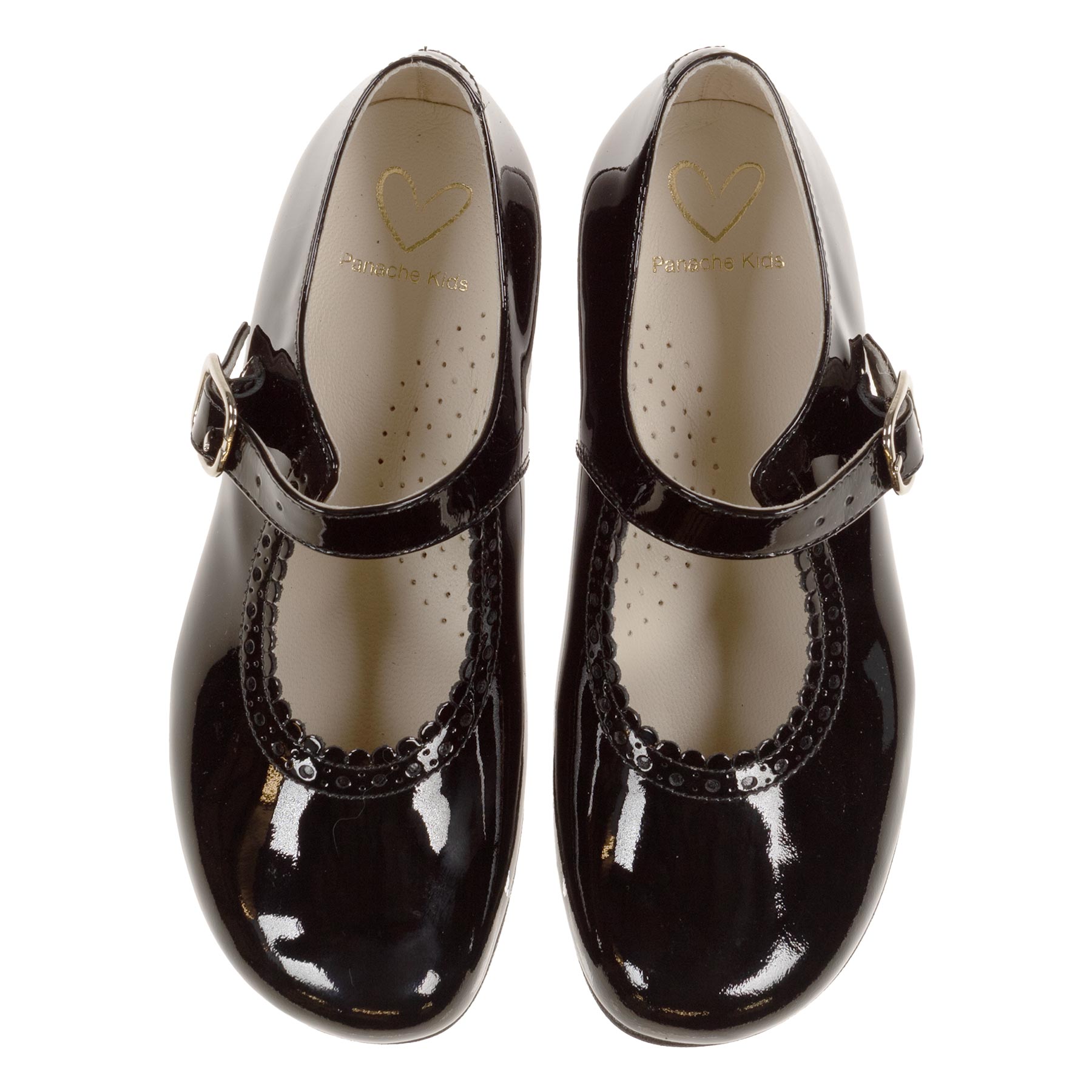 Panache Kids  Girls traditional Mary Jane shoe - soft Black patent  with leather lining and tunit sole, strap with metal buckle, traditional scallop edge on the front. Made in Spain with Spanish patent leathers.