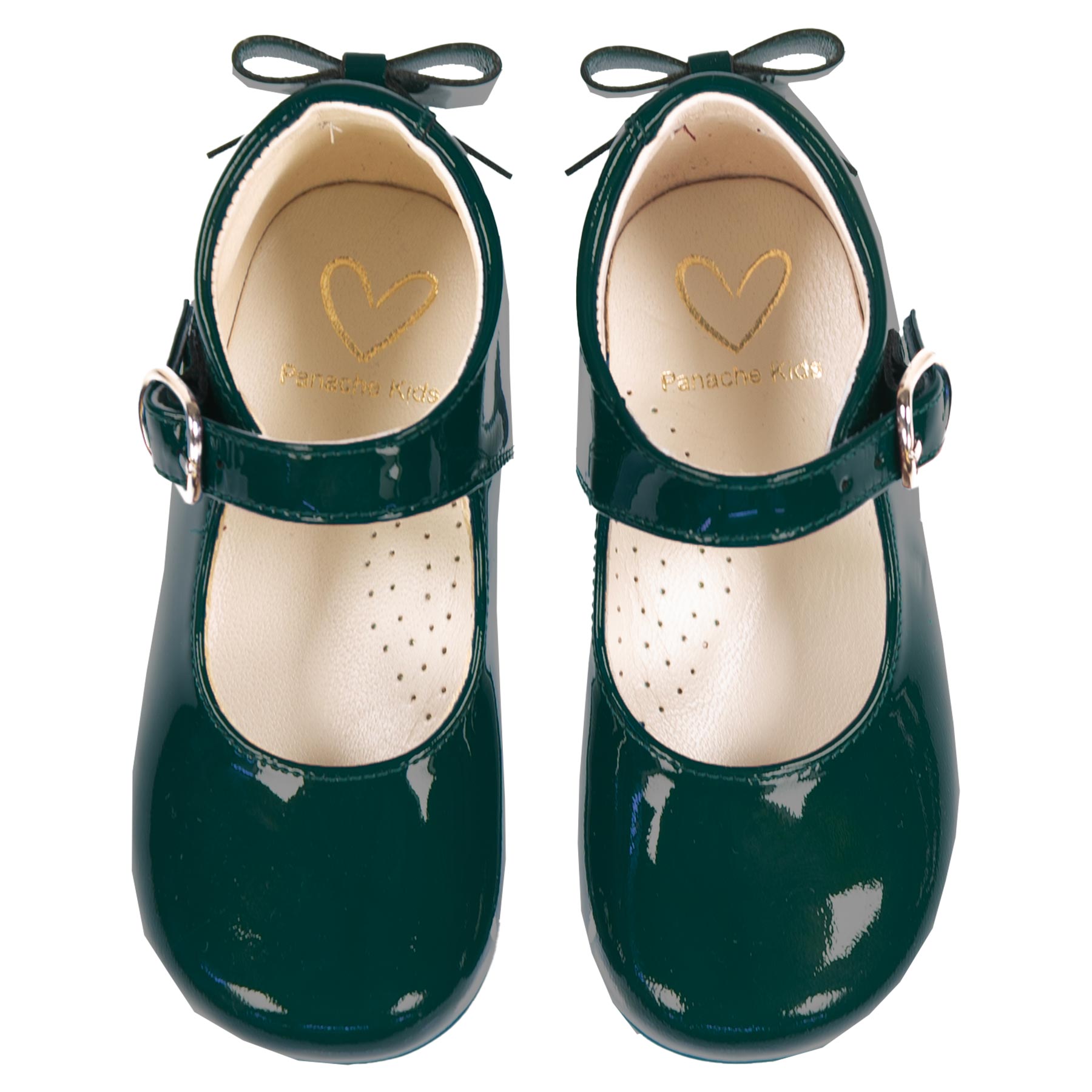 Panache Kids Exclusive traditional high back toddler girl's shoe with pretty bow on the back of the heel - with strap and buckle - made in soft patent leather with a natural leather lining, arch support, padded ankle support and cushioned leather insole - synthetic lightweight sole - round toe shape giving plenty of room for little toes to move. Made in a family owned factory in Spain who only make children's shoes.