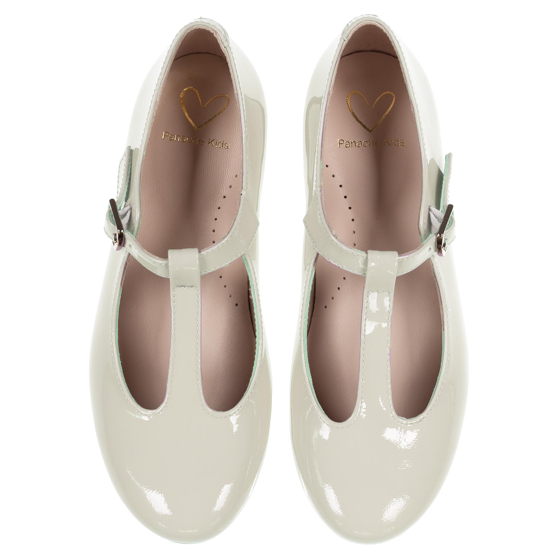 Panache  T Bar shoe in patent leather, with leather lining, a thin tunit sole, leather insole with arch support and a  metal buckle.  Made in Spain - FITTINGS ARE SMALL - TRY A SIZE BIGGER.  This is a party/special occasion shoe - not suitable for school.  Lots of colours available.
