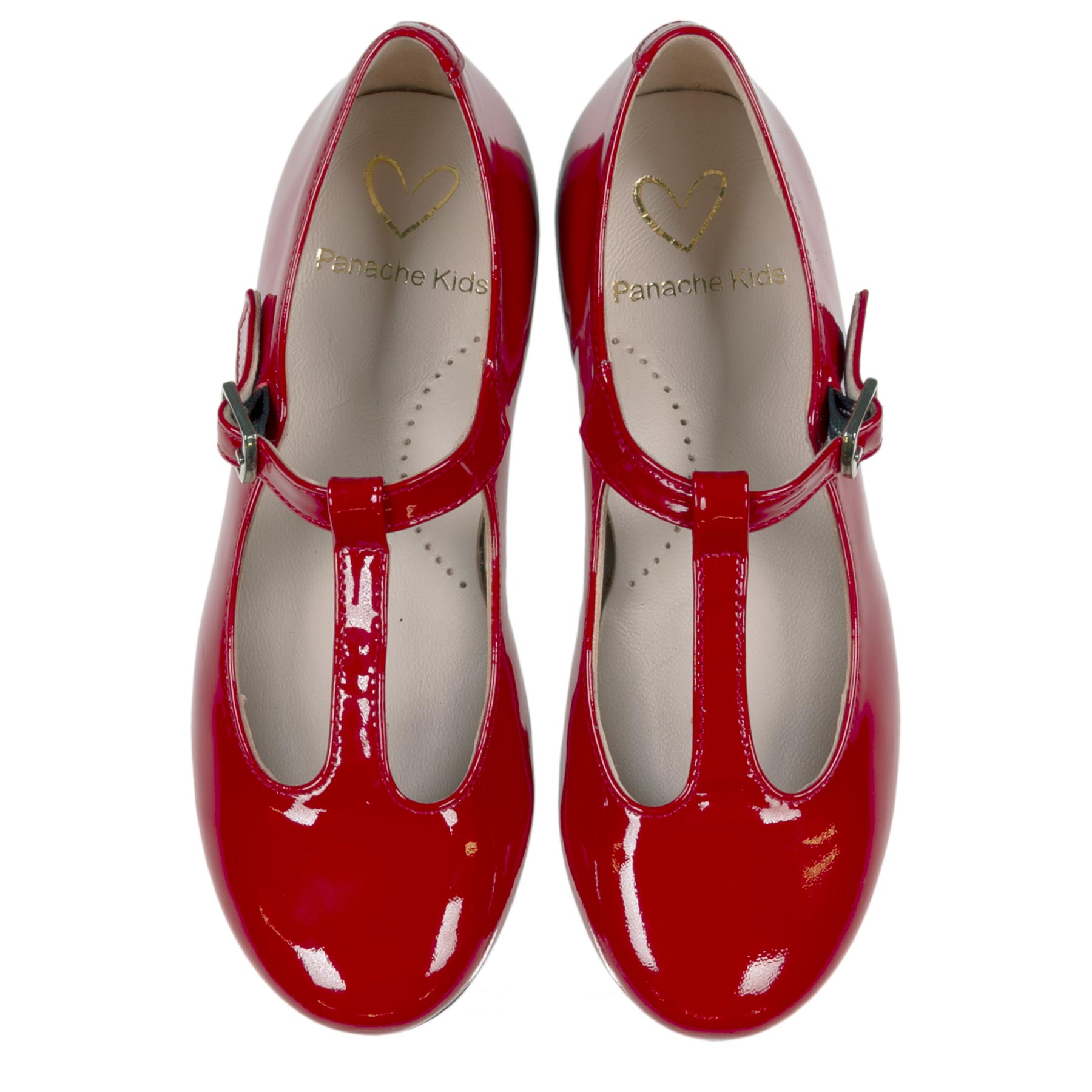 Panache  T Bar shoe in patent leather, with leather lining, a thin tunit sole, leather insole with arch support and a  metal buckle.  Made in Spain - FITTINGS ARE SMALL - TRY A SIZE BIGGER.  This is a party/special occasion shoe - not suitable for school.  Lots of colours available.