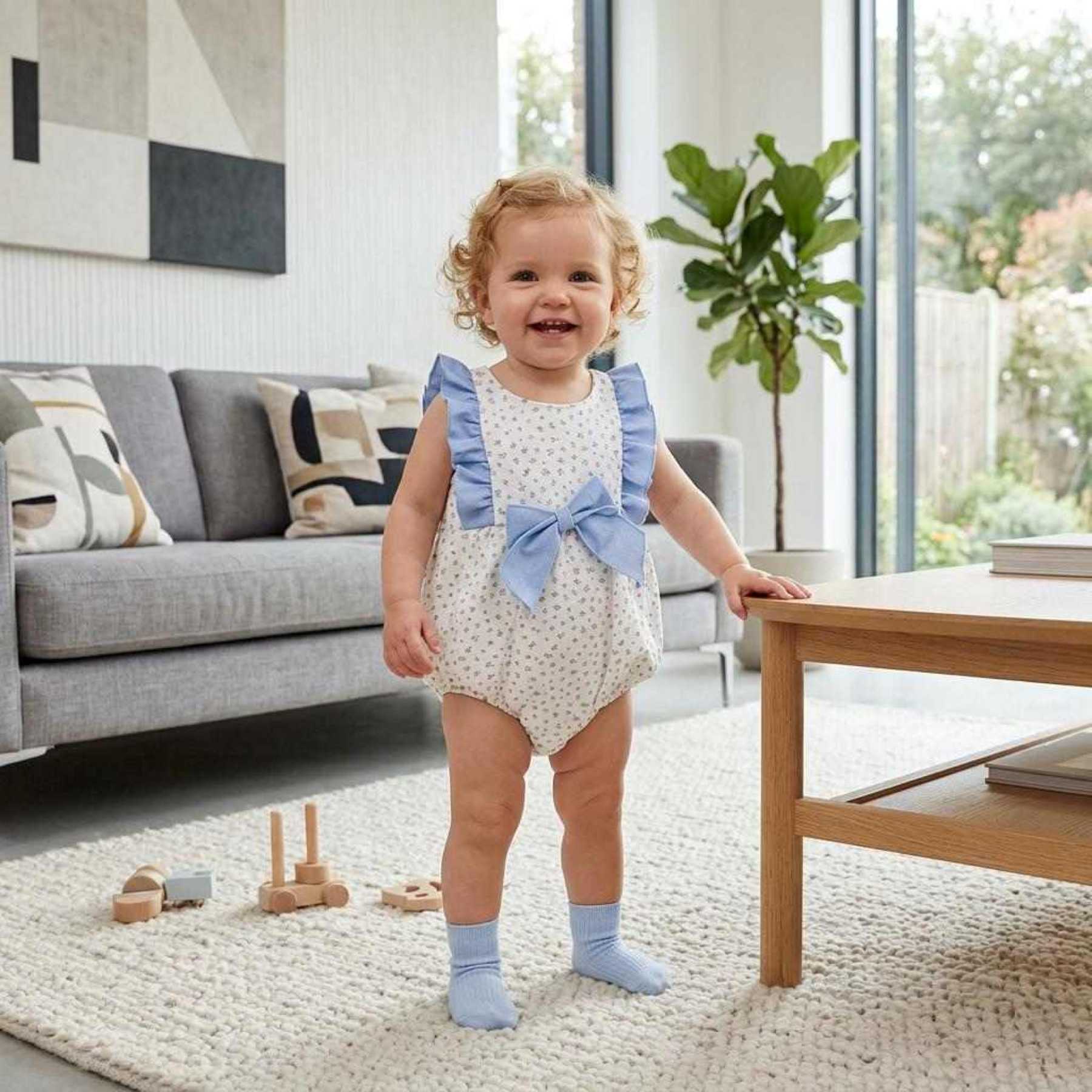 Rapife Summer Collection - easy to wear cotton romper with contrasting blue ruffles over the shoulders and fixed bow on the waist - poppers up the back and between the legs.  Loose fitting body.  Perfect summer outfit.