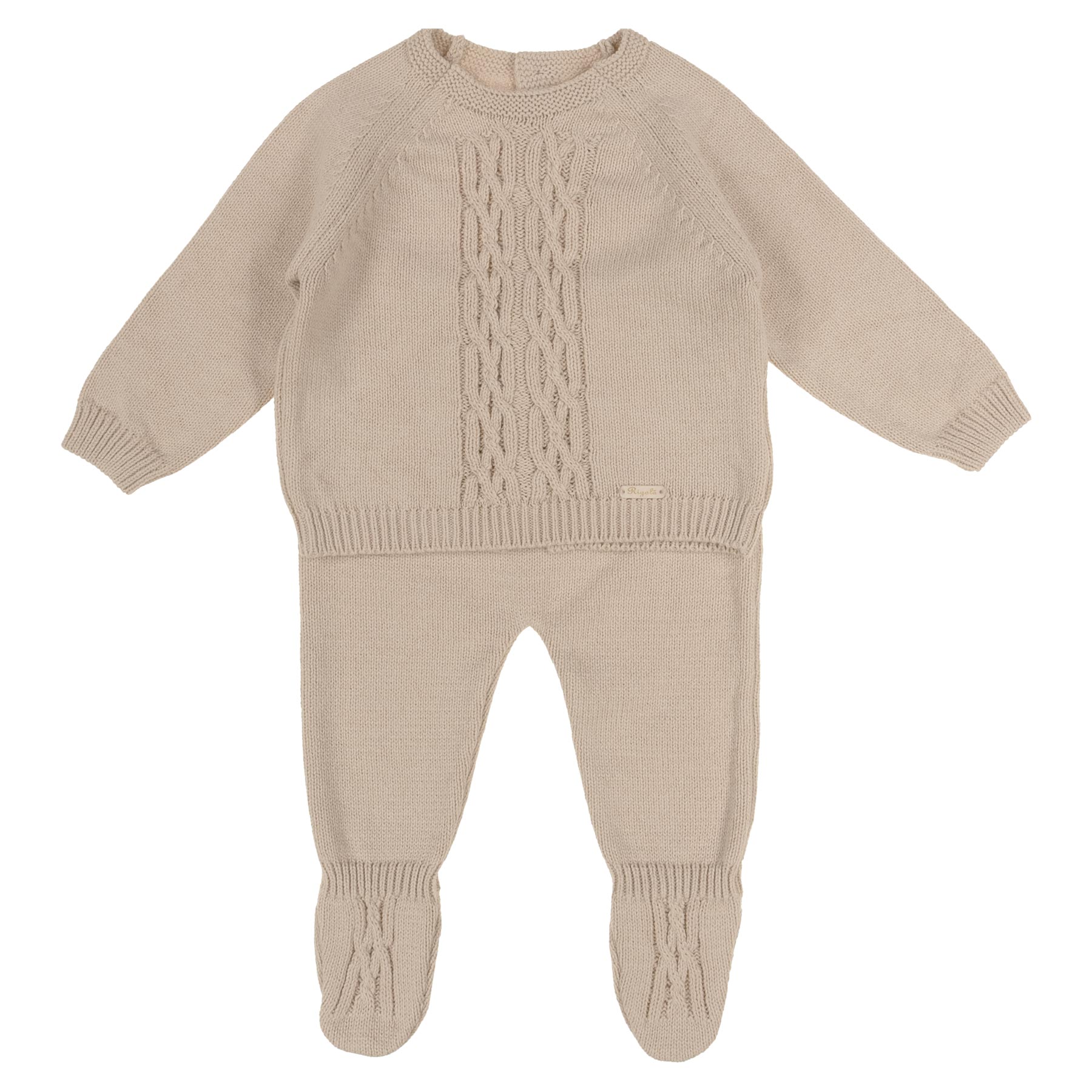 Rigola baby boys stylish knitted sweater & feet in leggings in a organic cotton knit.  Long sleeve sweater with mother of pearl buttons up the back and twisted cable knit on the front, and ribbed cuffs and waistband - with feet in leggings with matching knit on the feet - loose fitting body with lovely raised knit pattern on the front with charm.  This baby boys set is easy to wear and comfortable.  Made in Portugal.  Other matching items including matching knit blanket available.  Perfect for NEWBORN gifting and BABY SHOWERS.