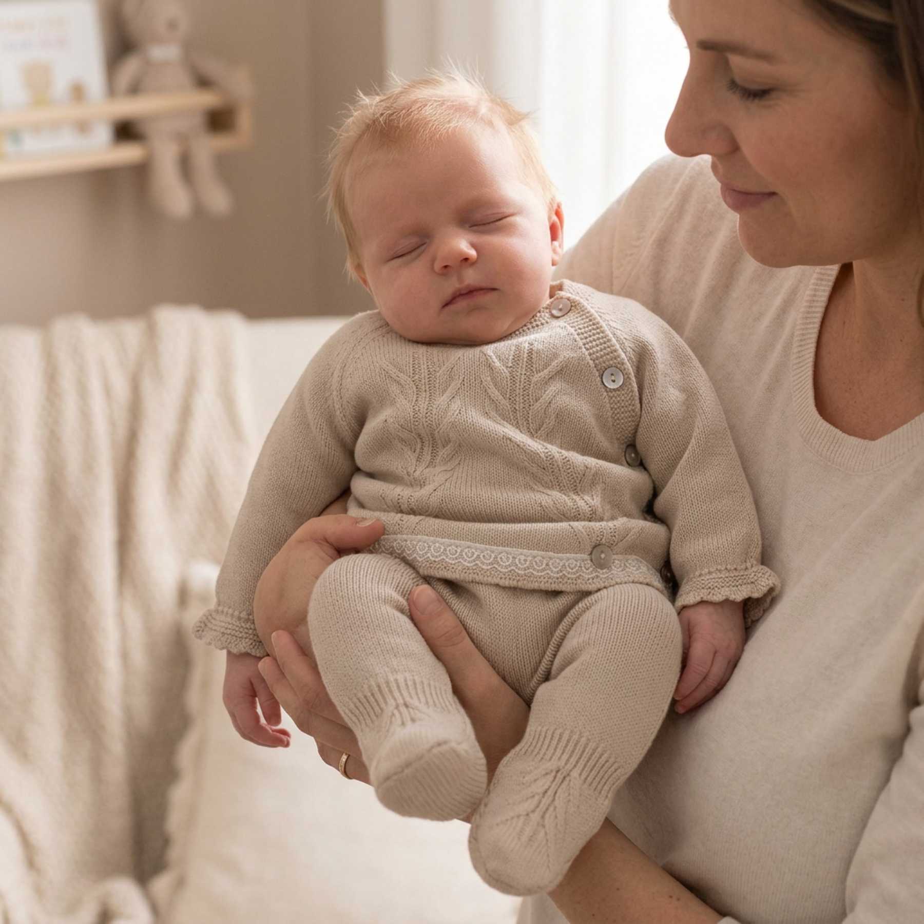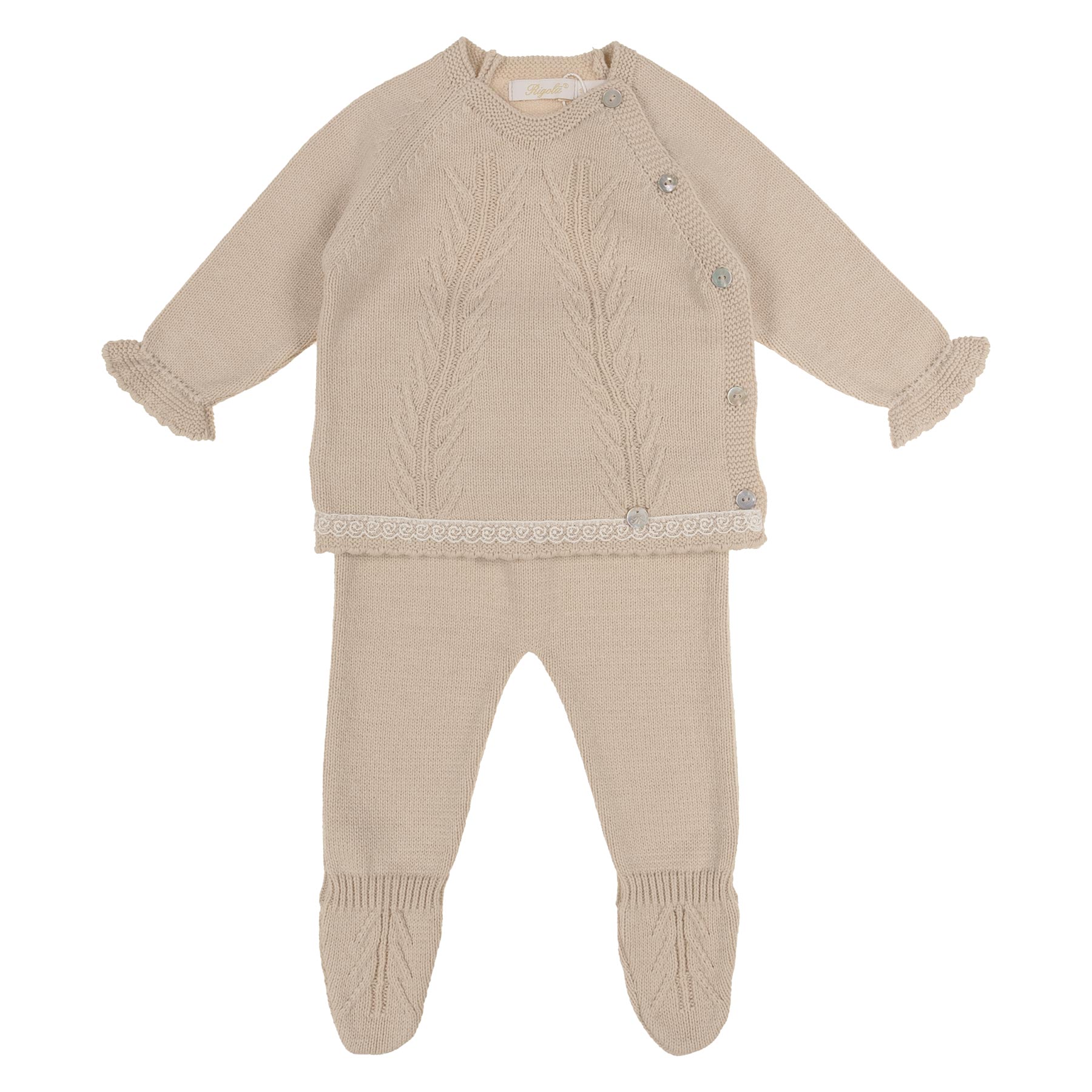 Rigola baby girls stylish knitted sweater & feet in leggings in a organic cotton knit. Long sleeve sweater with front opening body with mother of pearl buttons, with feet in leggings with matching knit on the feet - loose fitting body with lovely raised knit pattern on the front with charm. Ruffle cuffs and pretty scallop lace on the waist. This baby girls set is easy to wear and comfortable. Made in Portugal. Other matching items including matching knit blanket available. Perfect for NEWBORN gifting and BABY SHOWERS.