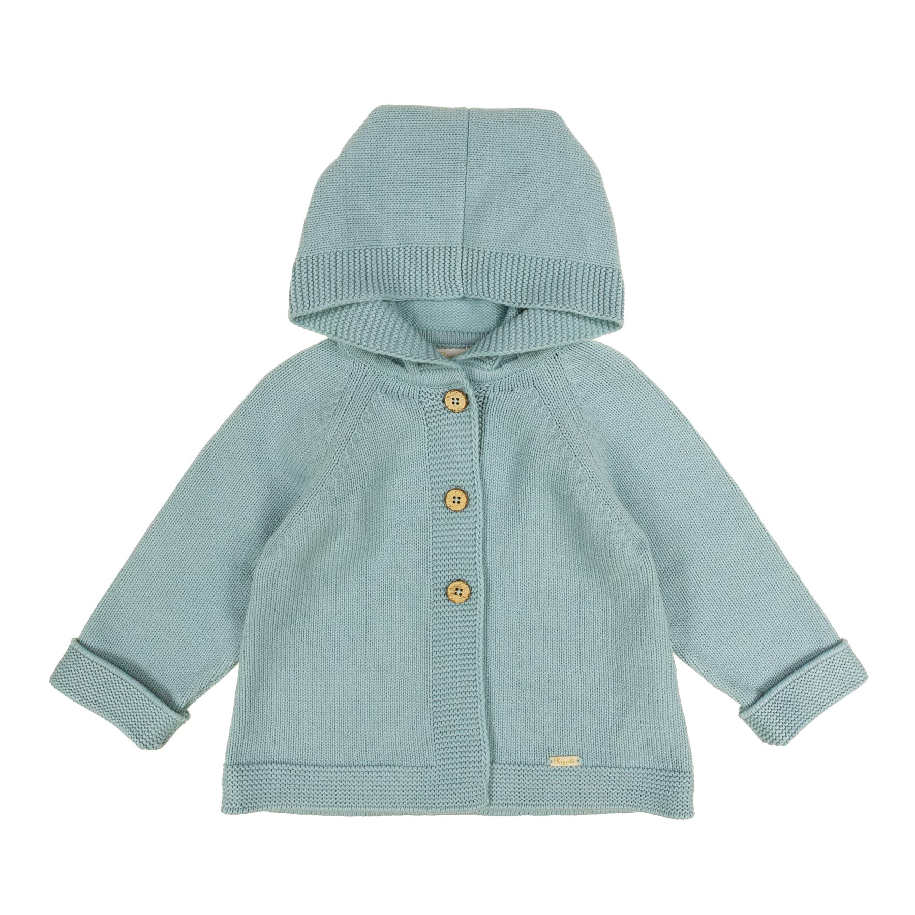 Rigola boys stylish knitted hooded cardigan/jacket in a organic cotton knit.  Long sleeve cardigan with front opening with oversized mother of pearl buttons, with hood with raised knit edge.   Loose fitting body in plain pearl knit with raised edge on the turn back cuffs and hem.  This boys gorgeous longer cardigan is easy to wear and comfortable.  Made in Portugal.  Other matching items including matching pom beanie available.