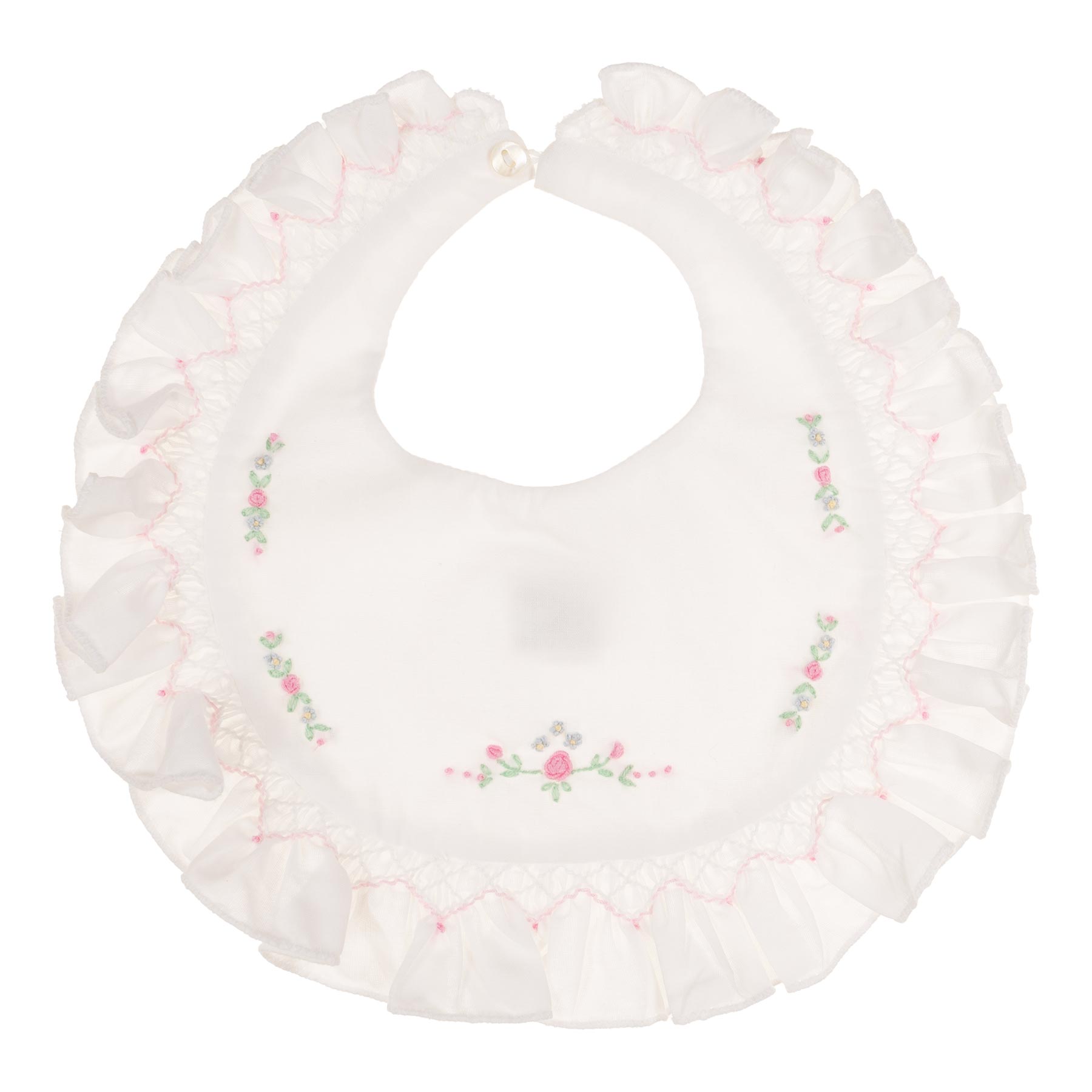 Sarah Louise Baby Girls embroidered bib with ruffle edge. Beautiful bib - double layer of lightweight polycotton, with smocked ruffles on the edge.   Pearl button to close.  A beautiful baby gift.
