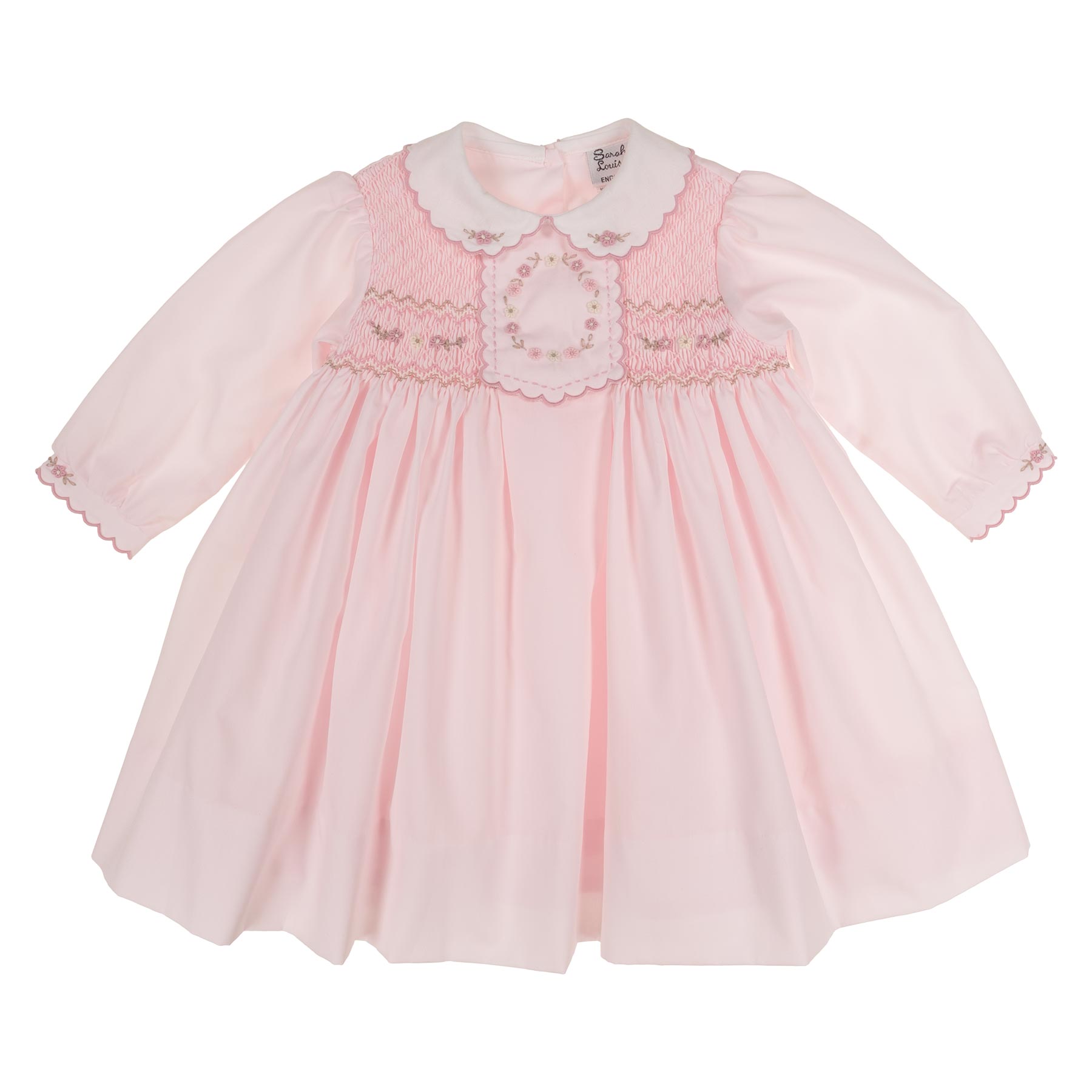 Sarah Louise Girls traditional puff long sleeve dress in poly cotton with gorgeous hand embroidered and hand smocked bodice with center panel. Scallop peter pan collar with embroidered flowers in pink and beige, very full skirt, buttons at the back from the waist with tie. Lined with Petticoat for extra comfort. This is an easy to wear dress. Perfect baby sister/big sister outfit which is available in Newborn to 18 months. Available in pale blue.