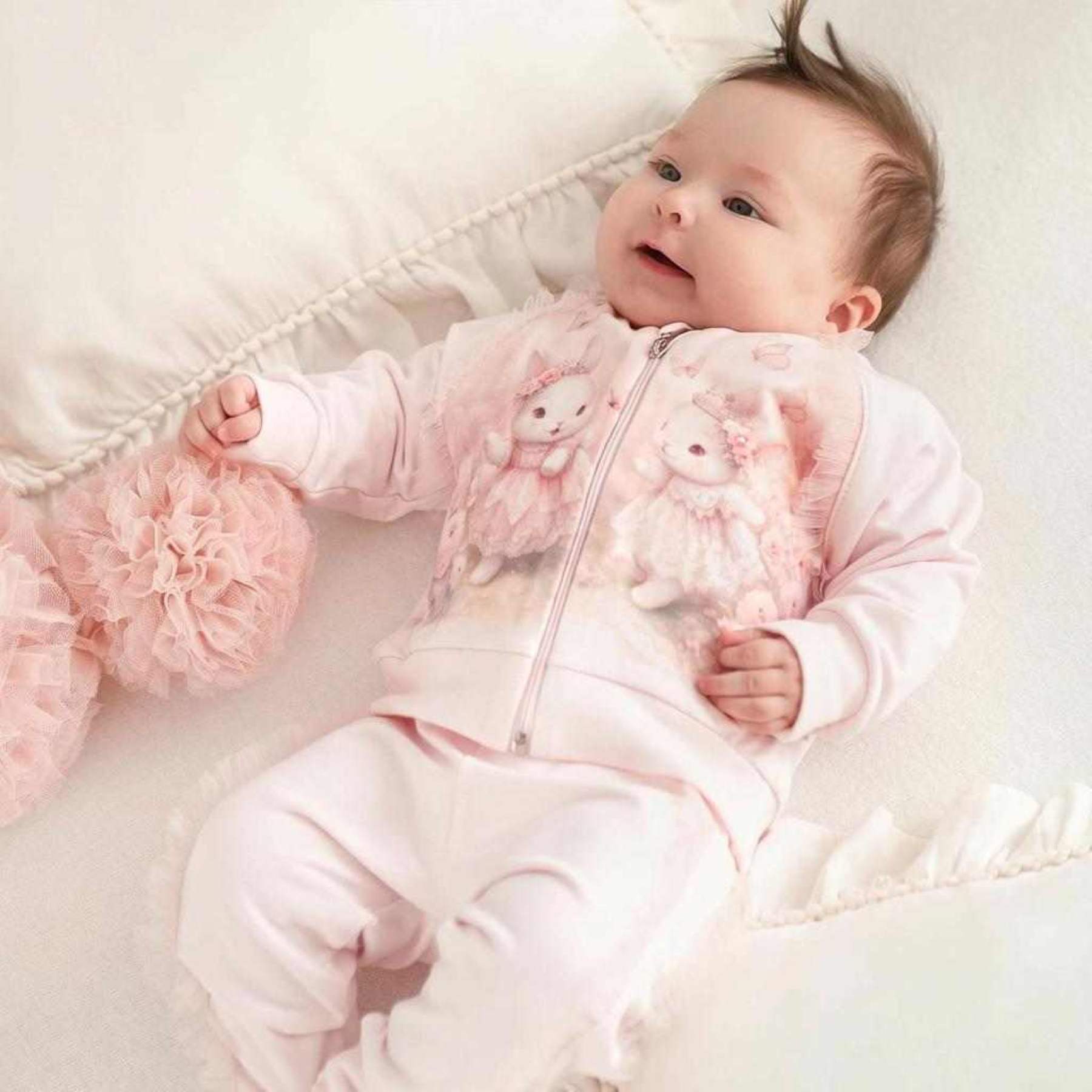 Sofija Nel collection - Tracksuit with bunny print - A cozy yet elegant set featuring a floral printed bomber jacket and matching pants with tulle detail. This baby girl's outfit is made from soft and breathable 100% cotton with an Oeko-Tex certificate, ensuring safety for the baby. It guarantees maximum comfort and ease of wear. Zipper front on the bomber jacket and comfortable elastic waistband for easy dressing.